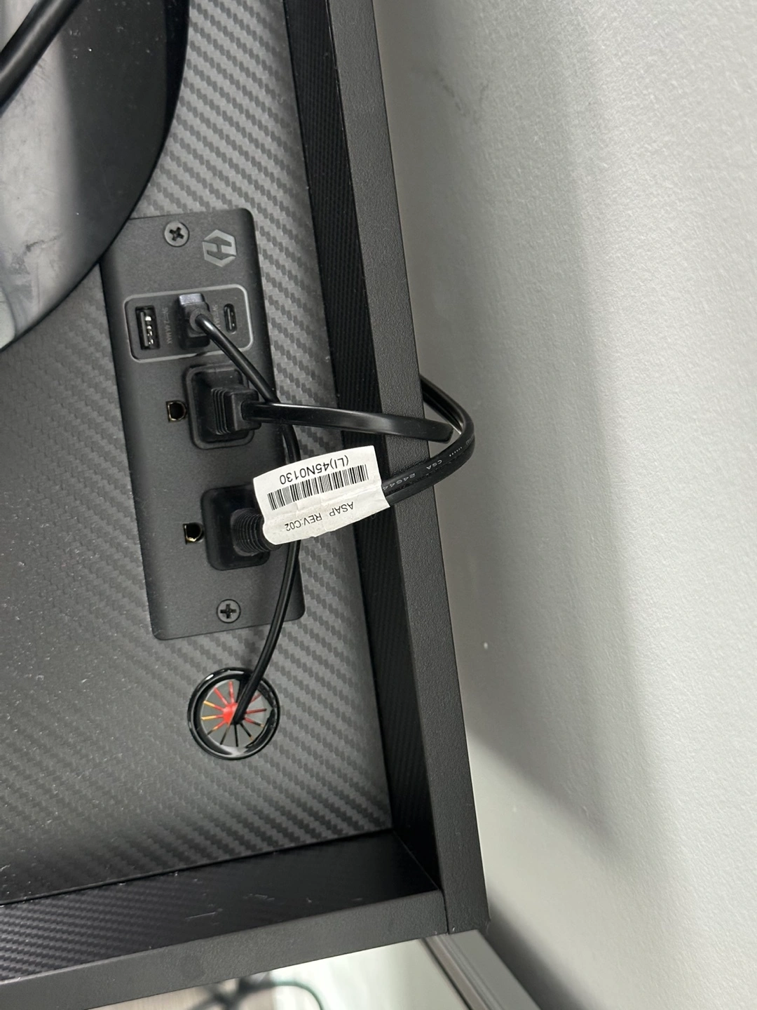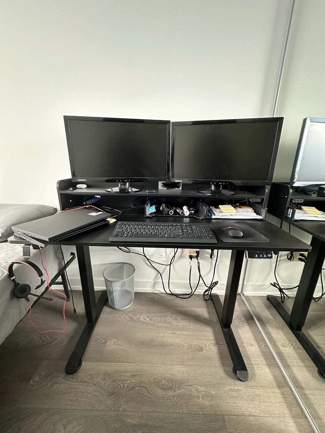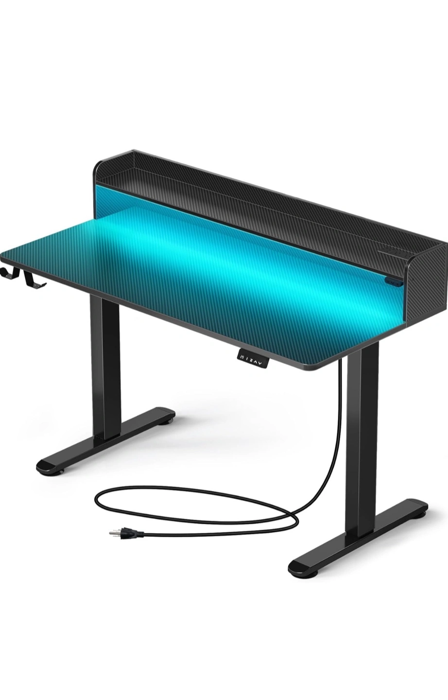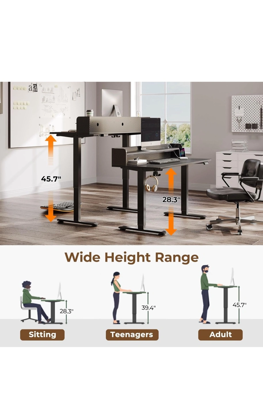 Electric standing desk, height adjustable. Black frame, carbon fibre textured top. Includes cable management tray. Great for home office or gaming setup. Adjustable Standing Desk with Carbon Fibre Texture 47.2 x 22.4 x adjustable height from 28.3 to 45.7