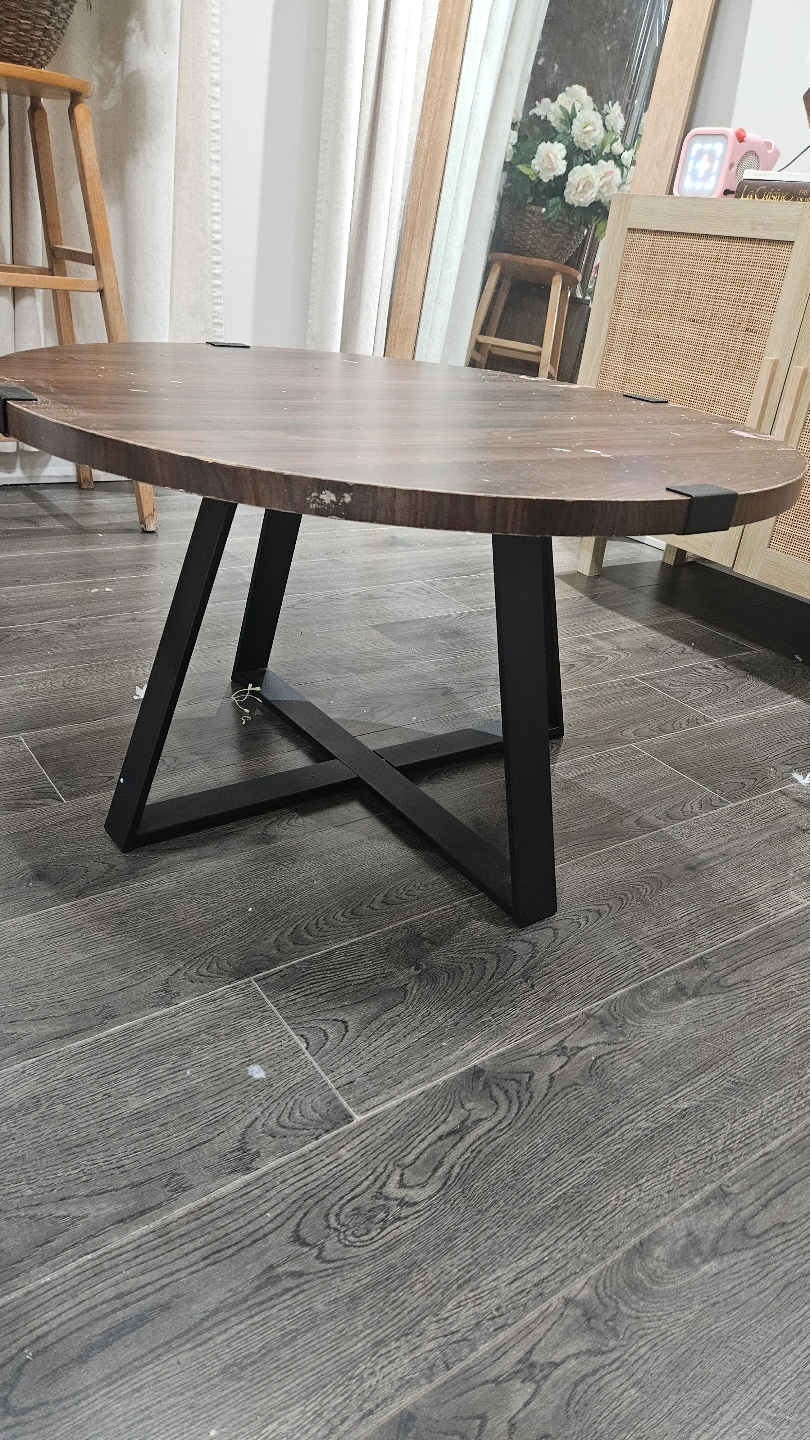 Round coffee table. Dark brown wood top. Black metal legs. Simple design. Some minor scratches and wear.