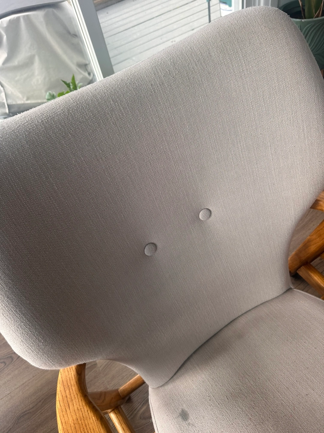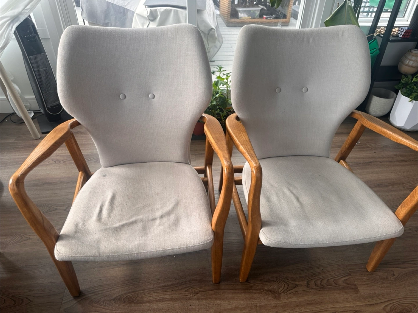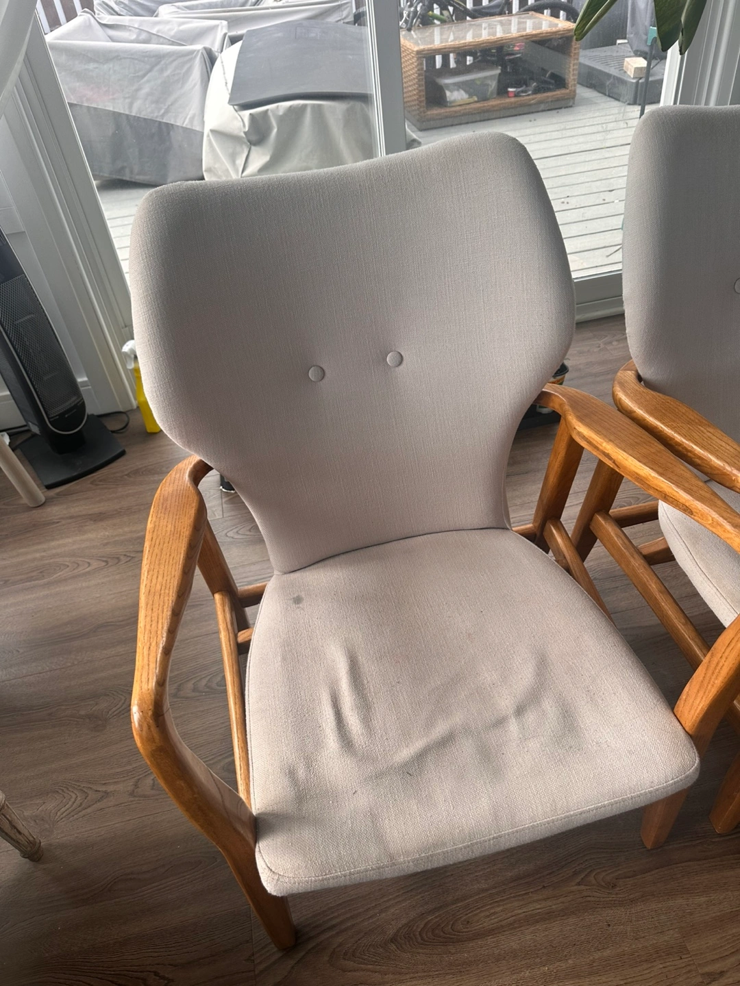 Two armchairs. Light grey fabric. Wooden frame. Mid-century modern style. Button tufting on the back. Small staining in one of the chair…can be upholstered/diy project… Frame is in excellent condition. Non smoking home