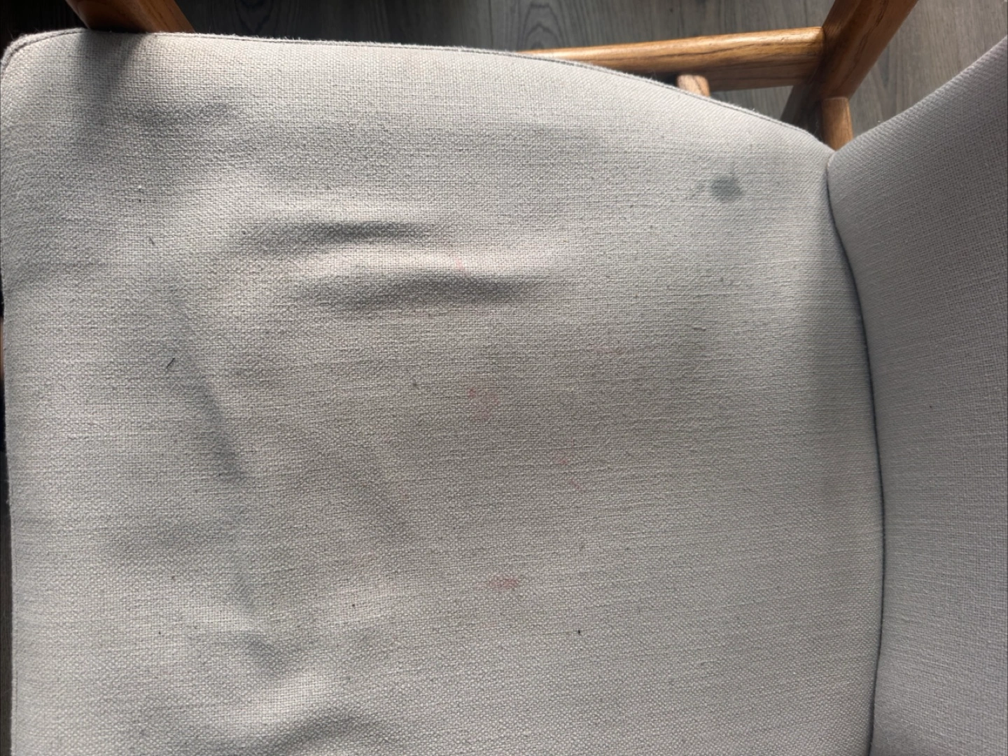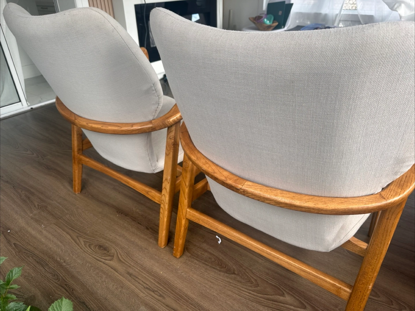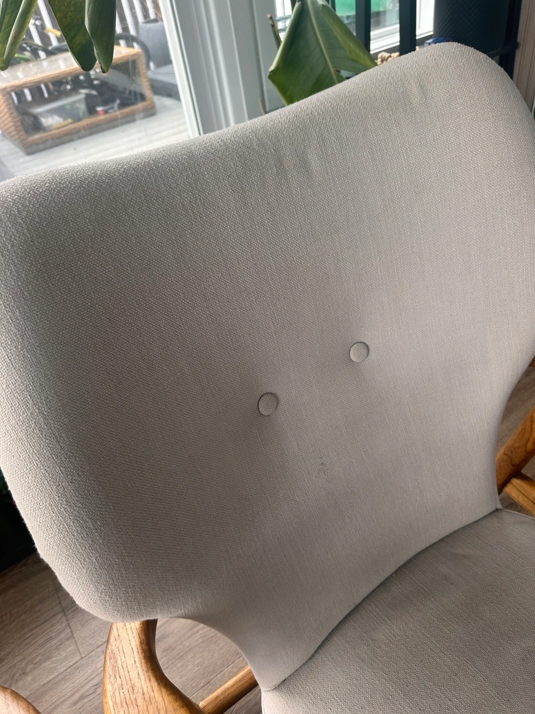Two armchairs. Light grey fabric. Wooden frame. Mid-century modern style. Button tufting on the back. Small staining in one of the chair…can be upholstered/diy project… Frame is in excellent condition. Non smoking home