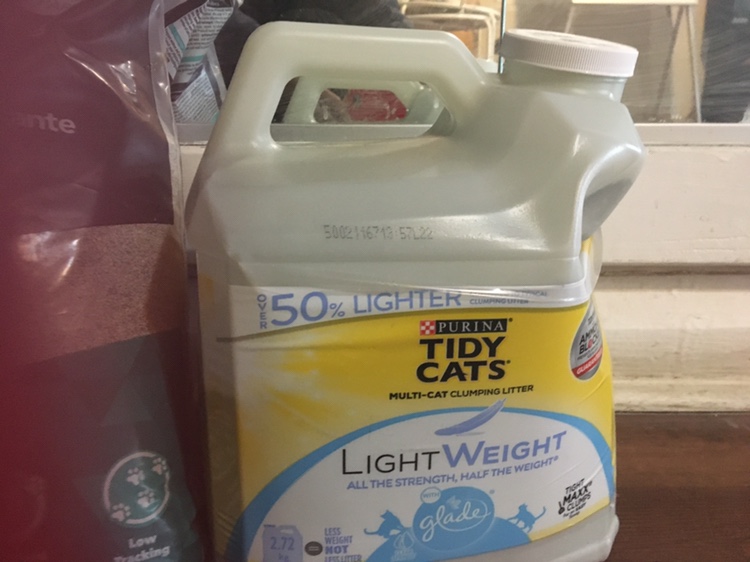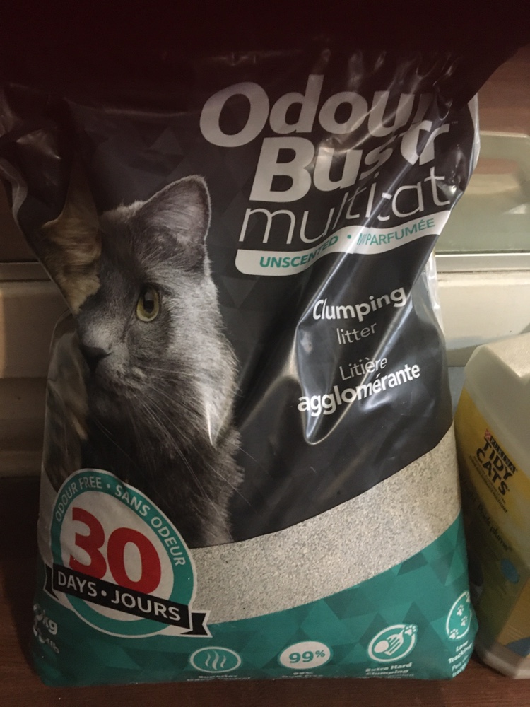 1 Large bag of unscented clumping Odour Buster cat litter. Also includes a jug of Purina Tidy Cats Lightweight clumping litter. Both are multi-cat litters. The bag has a little hole but the litter is almost 12 kg, the clumping one is opened and has more than 2.5 kg