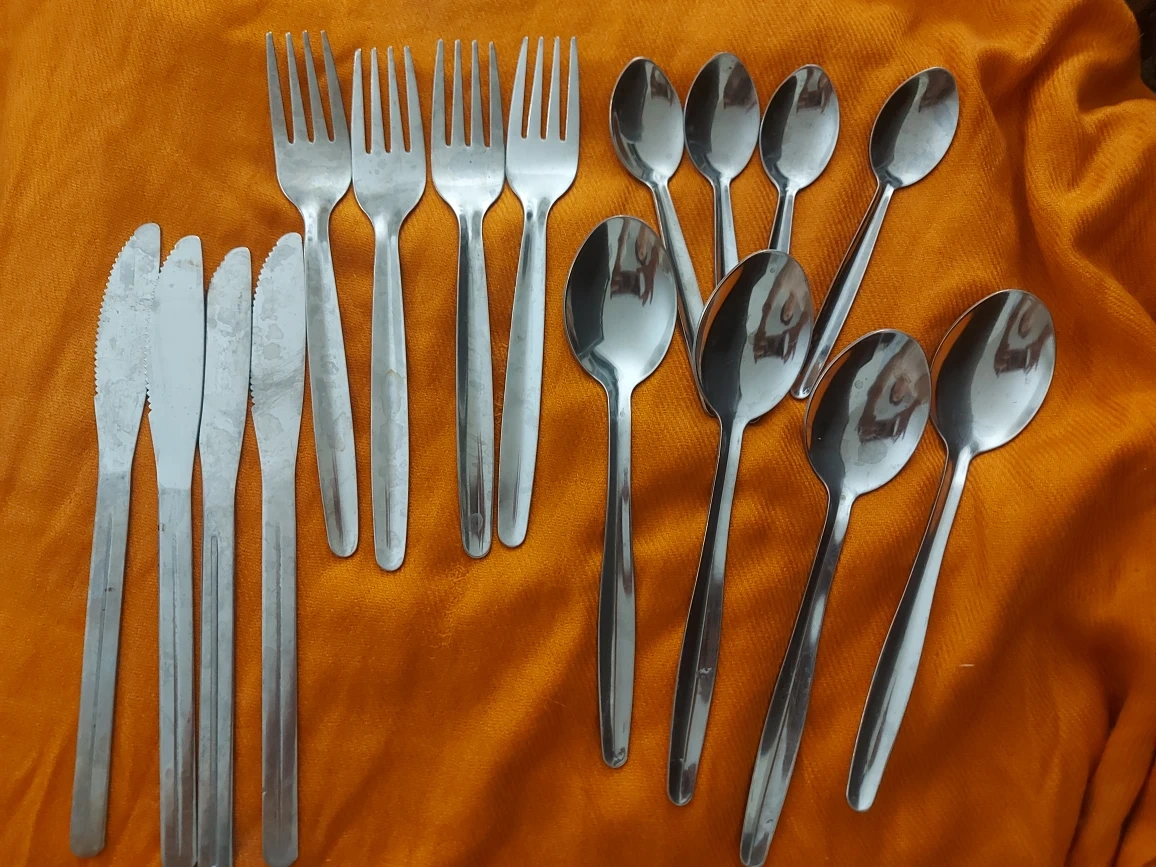 16 piece stainless steel cutlery set. Fully washed and sanitized. Water spots can be cleaned with polish or toothpaste. Good starter kit. Contains: 4 Forks 4 Knives 4 Teaspoons 4 Tablespoons Pickup and cash only.