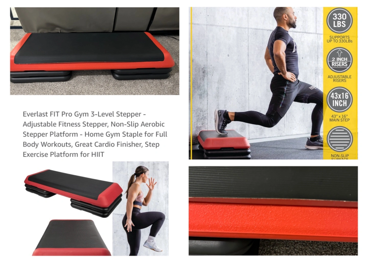 Adjustable fitness stepper. Non-slip aerobic stepper platform. Great cardio staple for full body workouts. Step exercise platform for HIIT. Three levels.