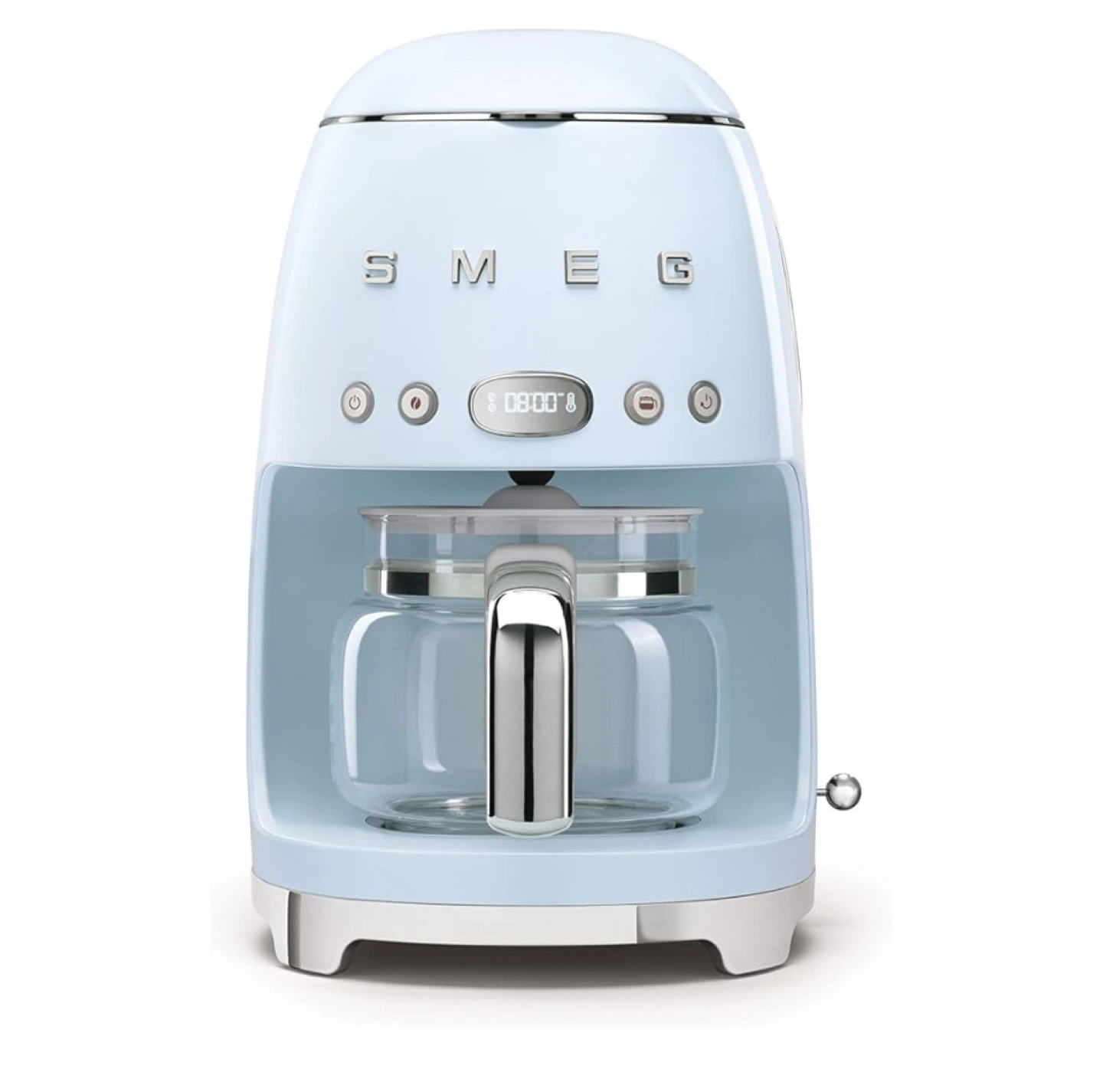 Beautiful pastel blue SMEG drip coffee maker. Glass carafe. Simple operation. Retro design.