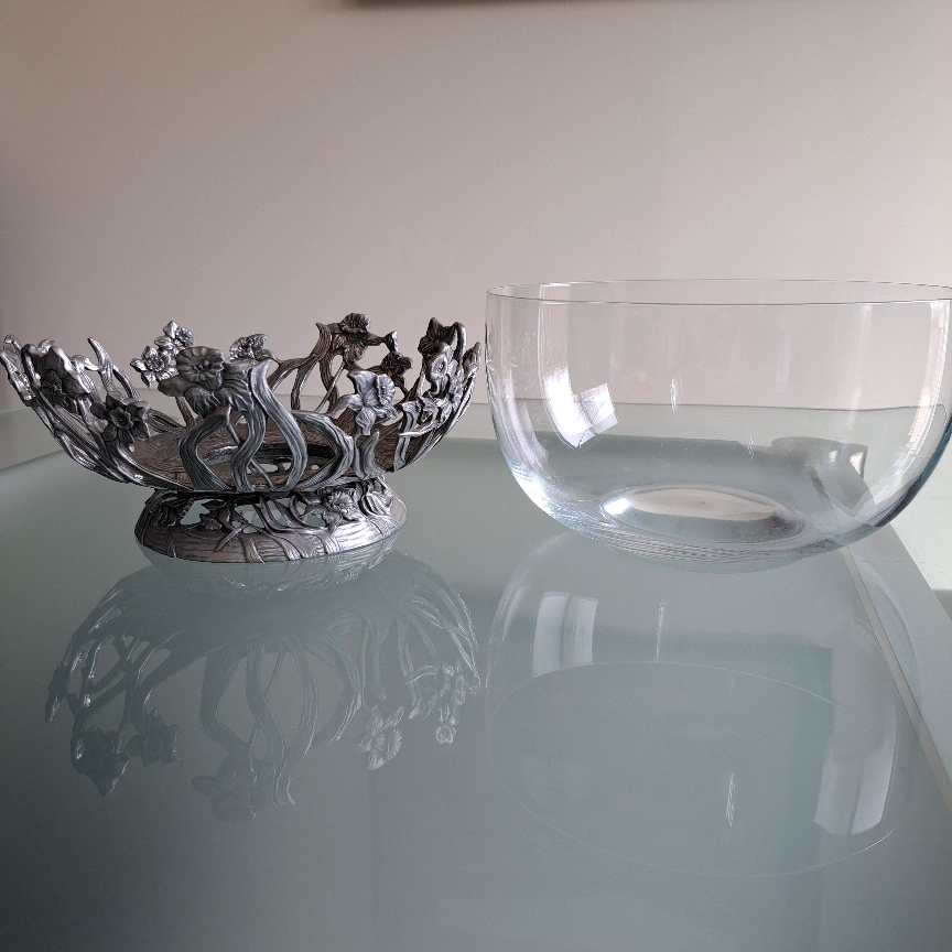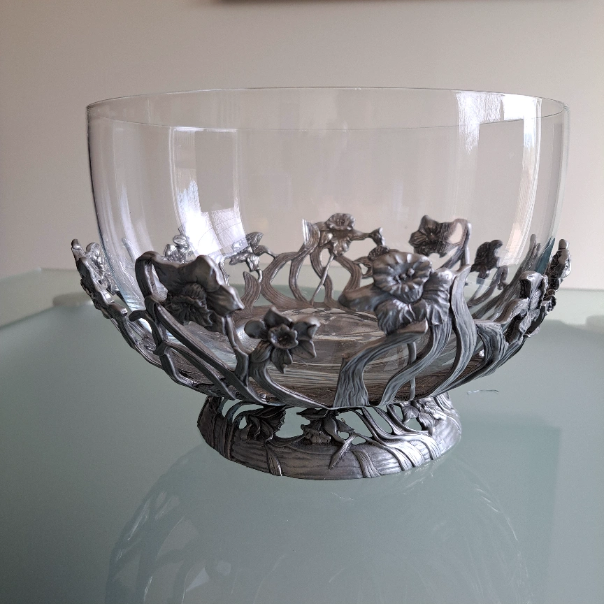 Beautiful vintage fruit bowl. Features a pewter base with a floral design and a clear glass bowl. Elegant centrepiece for any table. Perfect for fruit, candies, or other decorative items.