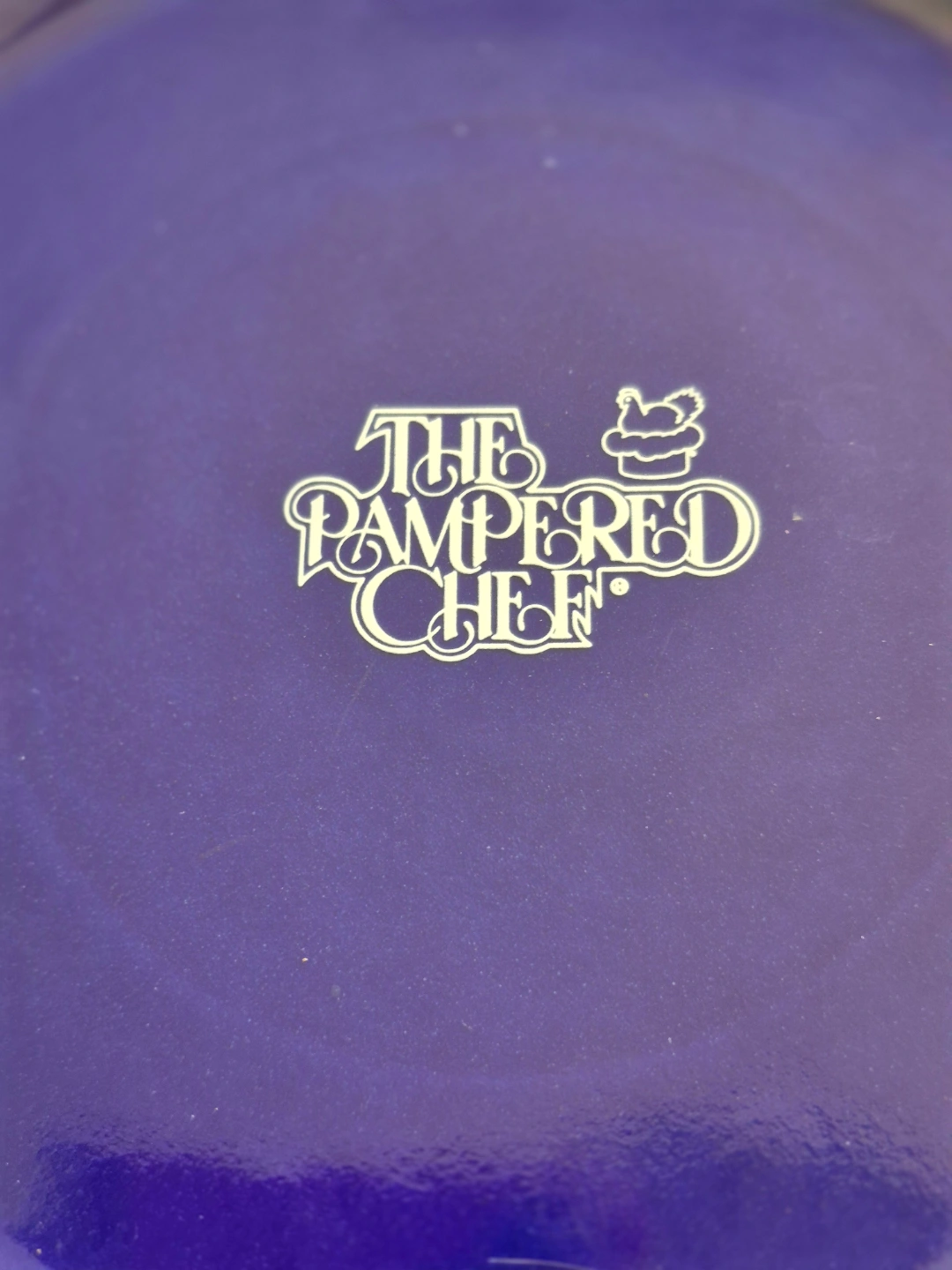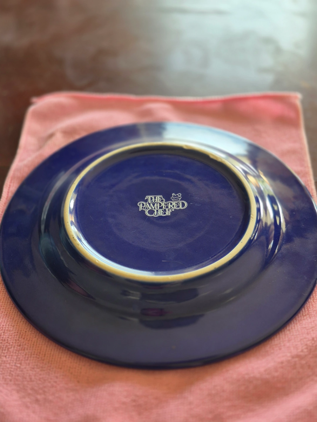 this is a high quality ceramic Pampered Chef Plate. colbalt blue. 10.5 x 10.5 perfect for adding a touch of whimsy to your table setting. Plate has no chips, cracks or brakes. New, never used, collecting dust in my hutch. it's ideal for special occasions or make everyday dining a bit special.