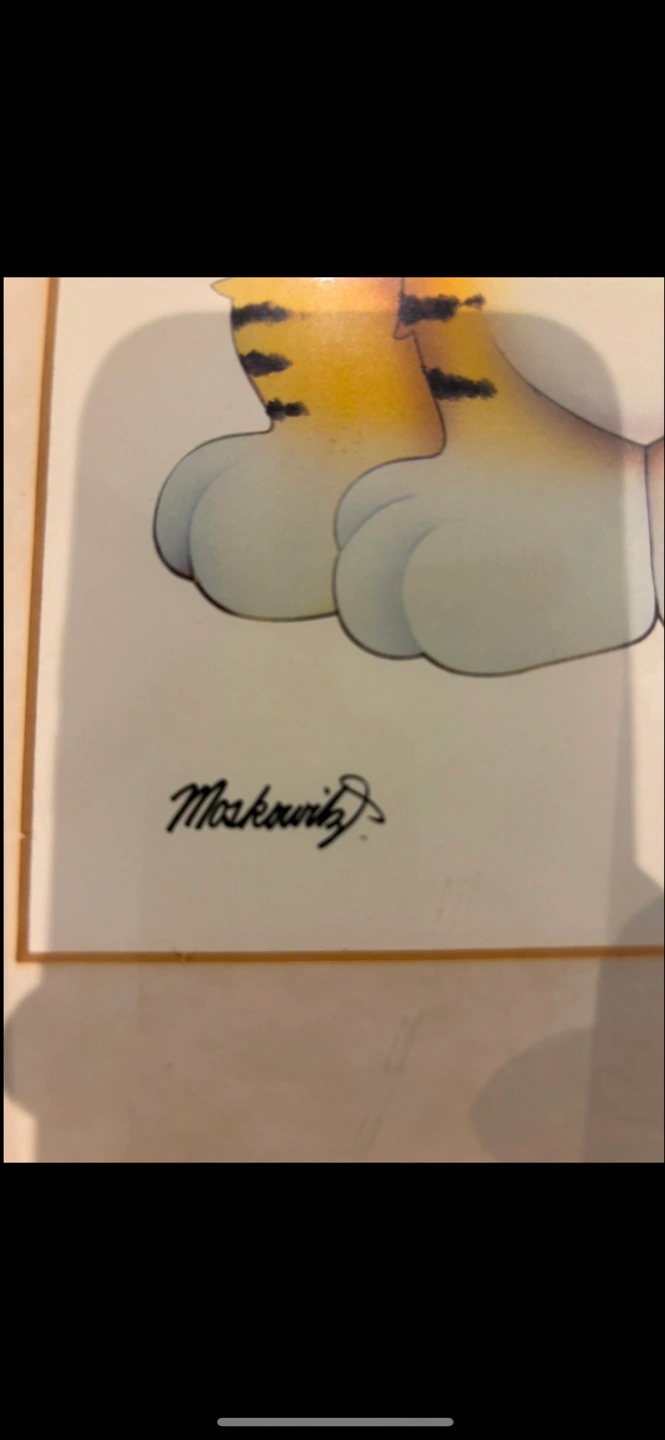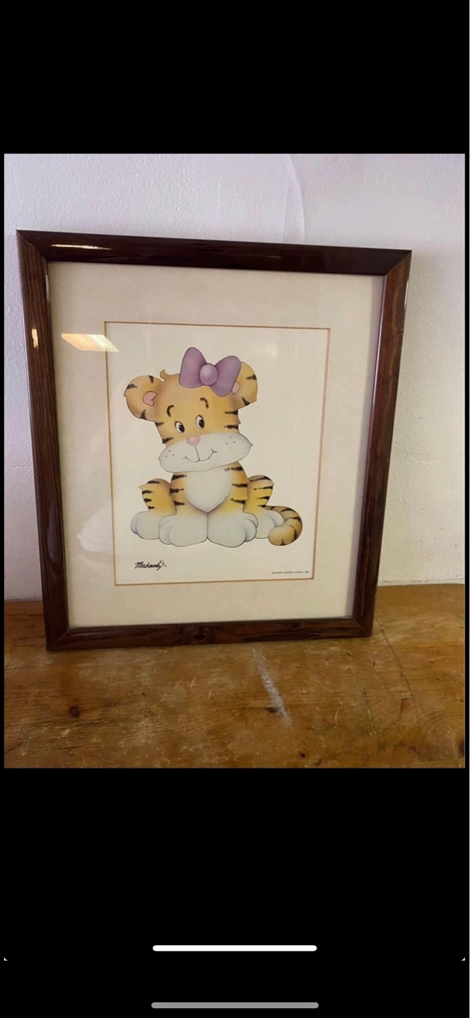 Adorable framed print of a cartoon tiger. Features a purple bow. Dark brown frame. Measures approximately 18" x 22". Artist signature visible. Copyright 1983.