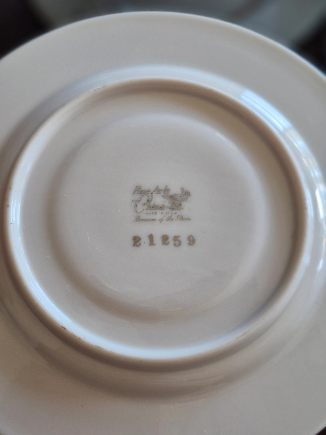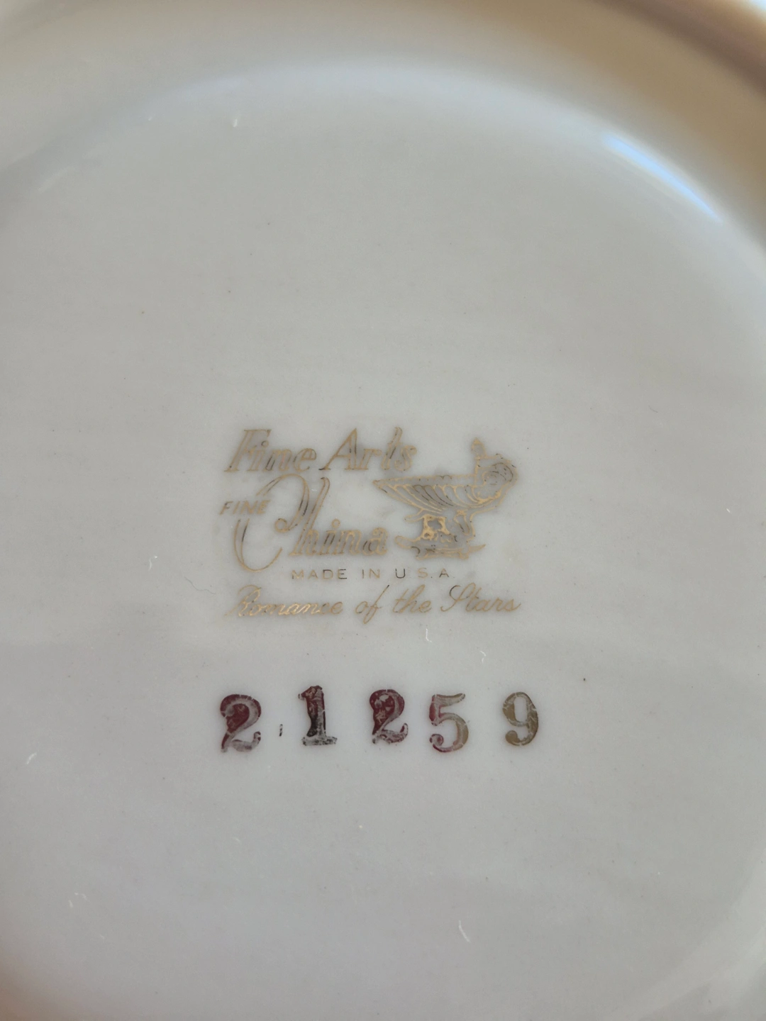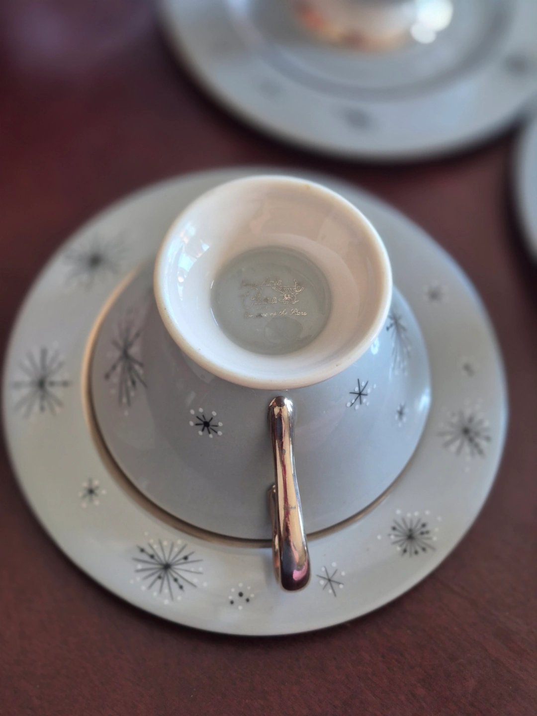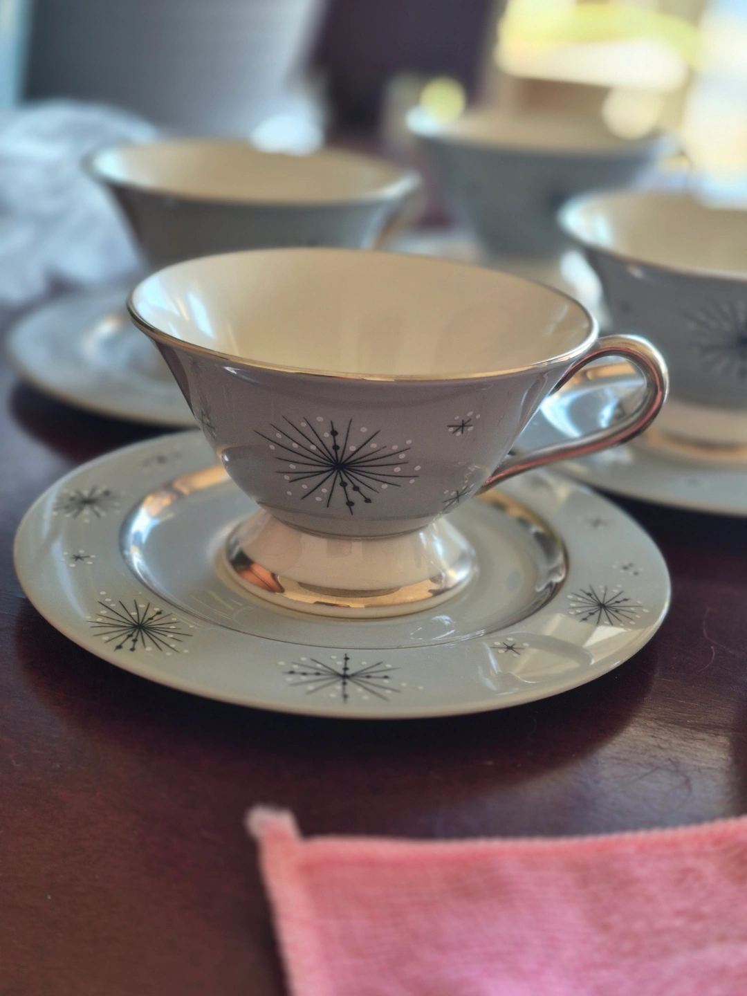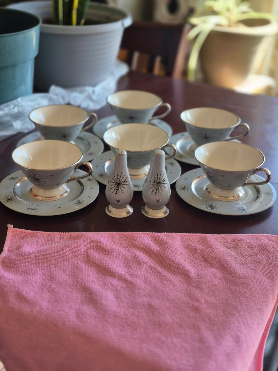 this is a stunning set of vintage Fine Arts China tea cups, saucers, and salt and pepper shakers, perfect for adding a touch of elegance to your tea time! This set has a light blue starburst design with gold trim. Note: the one shaker has been put back together, due to a brake. set never used. * 6 teacups * 6 saucers * salt & pepper shaker