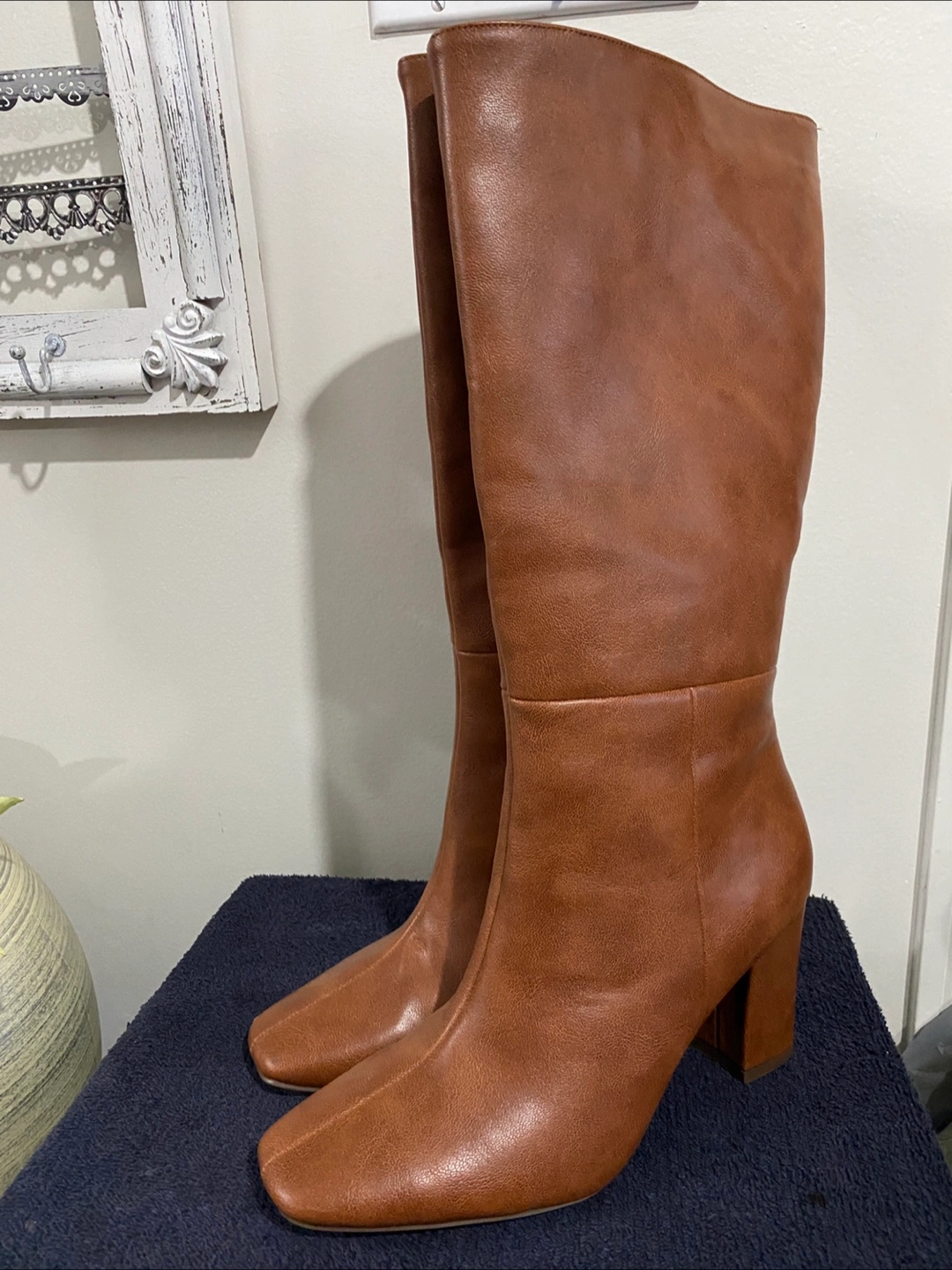 Women's knee-high boots. faux leather. Block heel. Square toe. Pull-on style. condition new