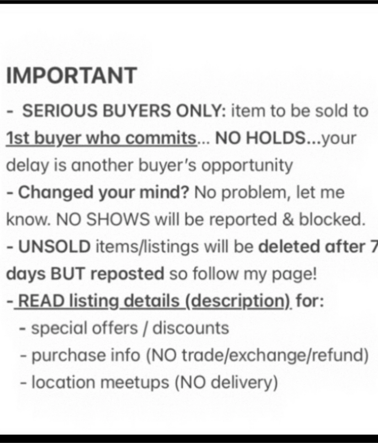 SERIOUS BUYERS ONLY / FINAL SALE / Cash Payment at pickup / NO HOLDS (Items will be sold on a FIRST-COME/PAYMENT-FIRST-SERVE basis!)