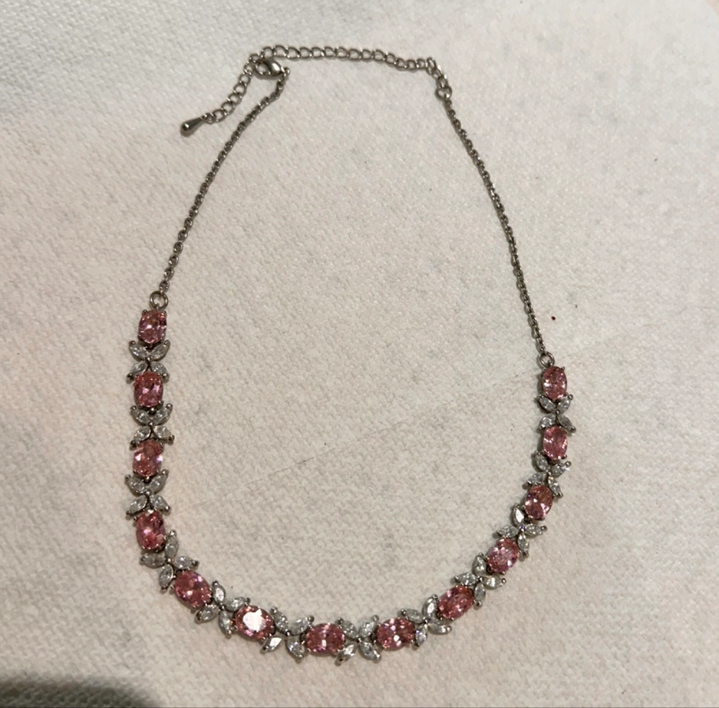 Beautiful necklace and earring set. Features pink oval gemstones and clear cubic zirconia accents. Silver-tone metal. Elegant and delicate.