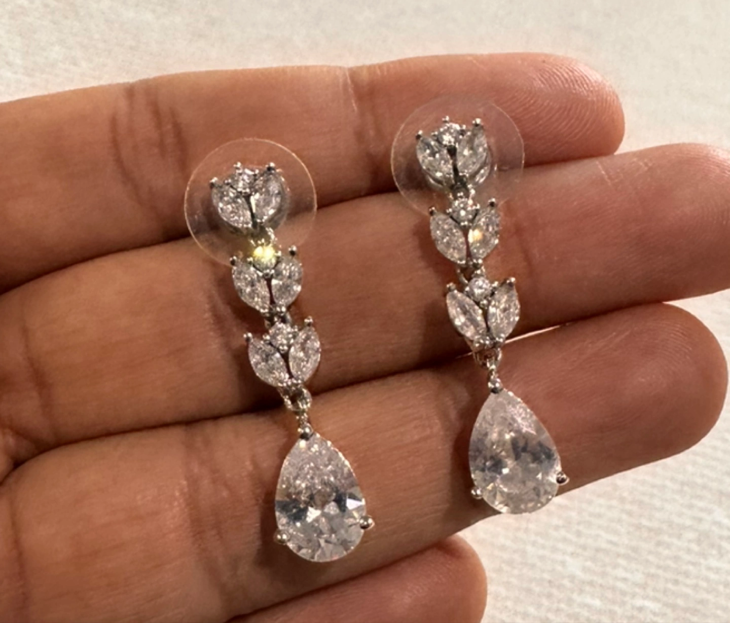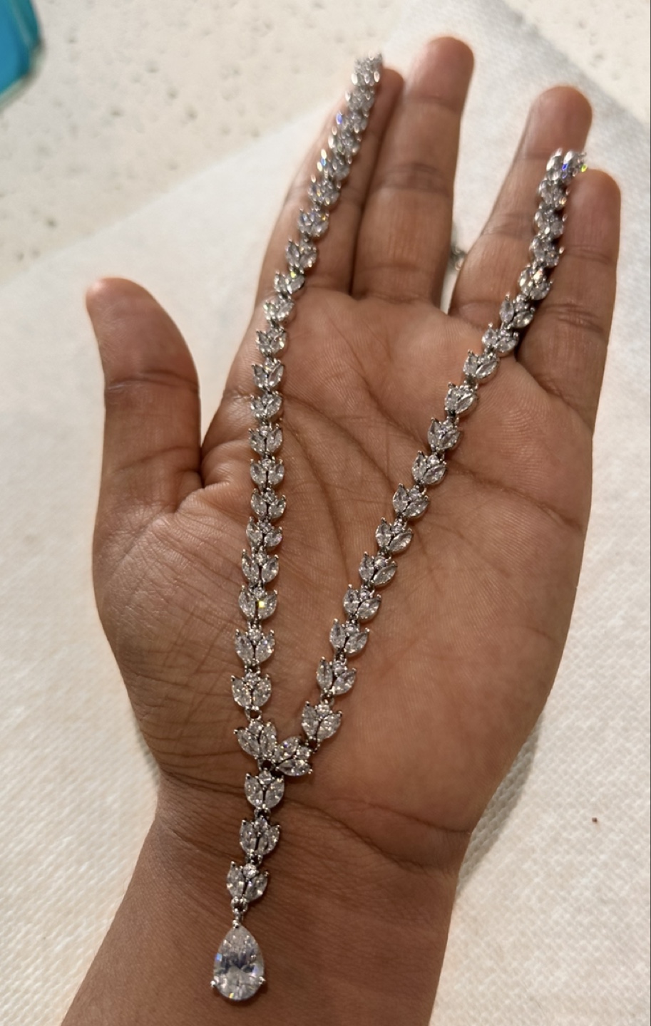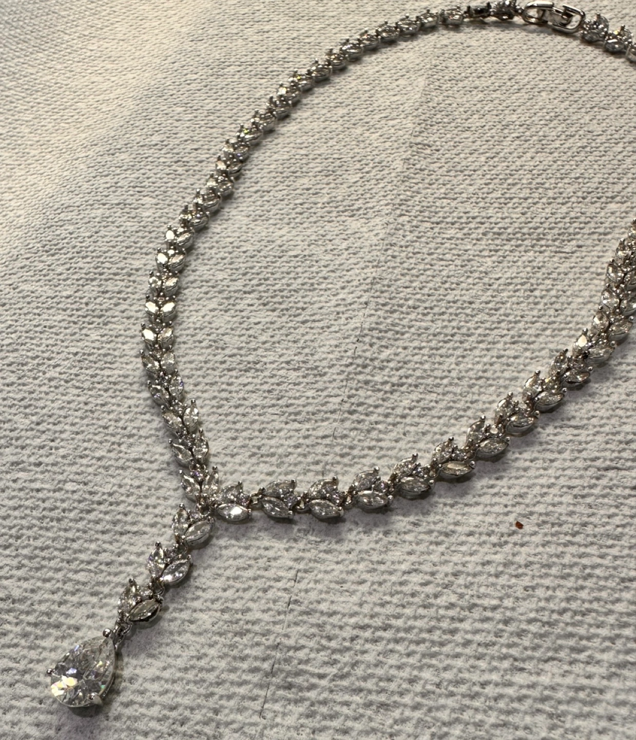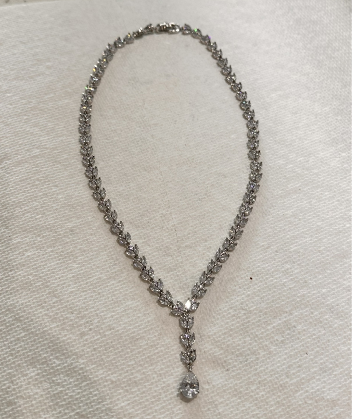 Beautiful bridal jewellery set. Includes a long necklace and matching dangling earrings. Pear-shaped and marquise-cut stones. Elegant and sparkly.