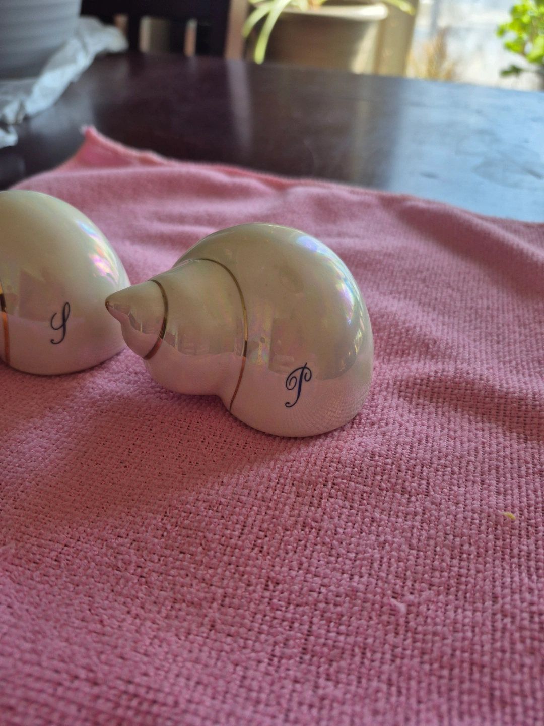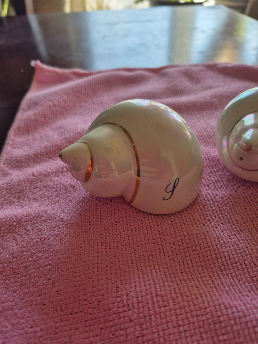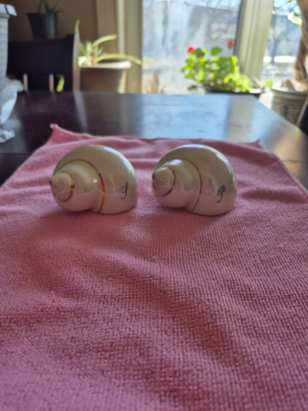 Vintage white pearl, gold tone seashell Salt and pepper shakers. add charm to your dining table. these delightful shakers feature elegant gold trim and are marked with 'S' and 'P' for easy iidentification. Pre-owned.
