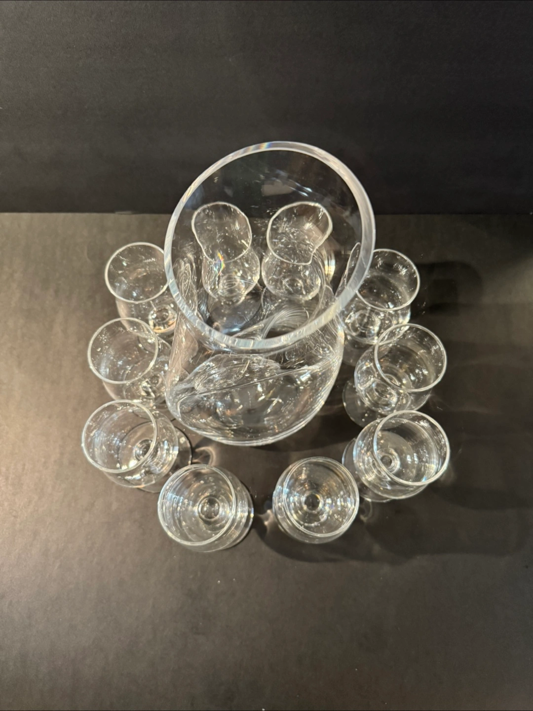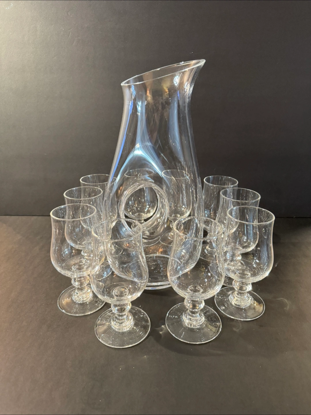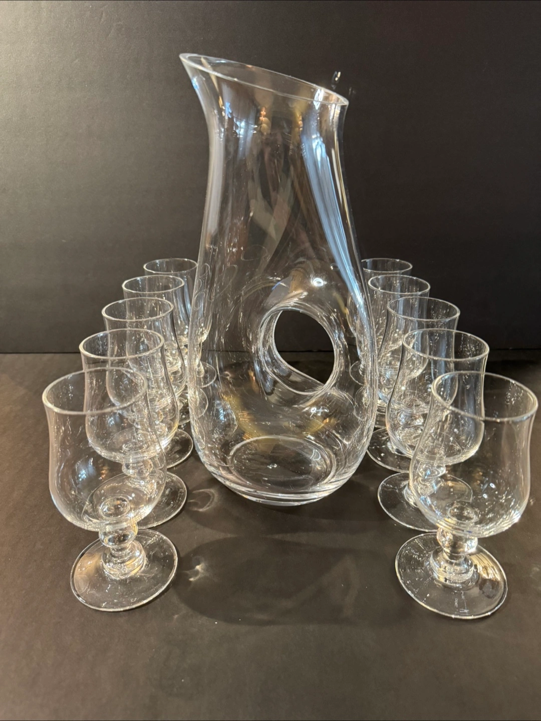 60Elegant glass decanter with unique cutout design. Includes ten matching stemmed glasses. Perfect for serving drinks.