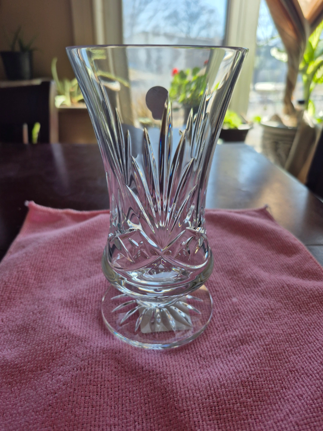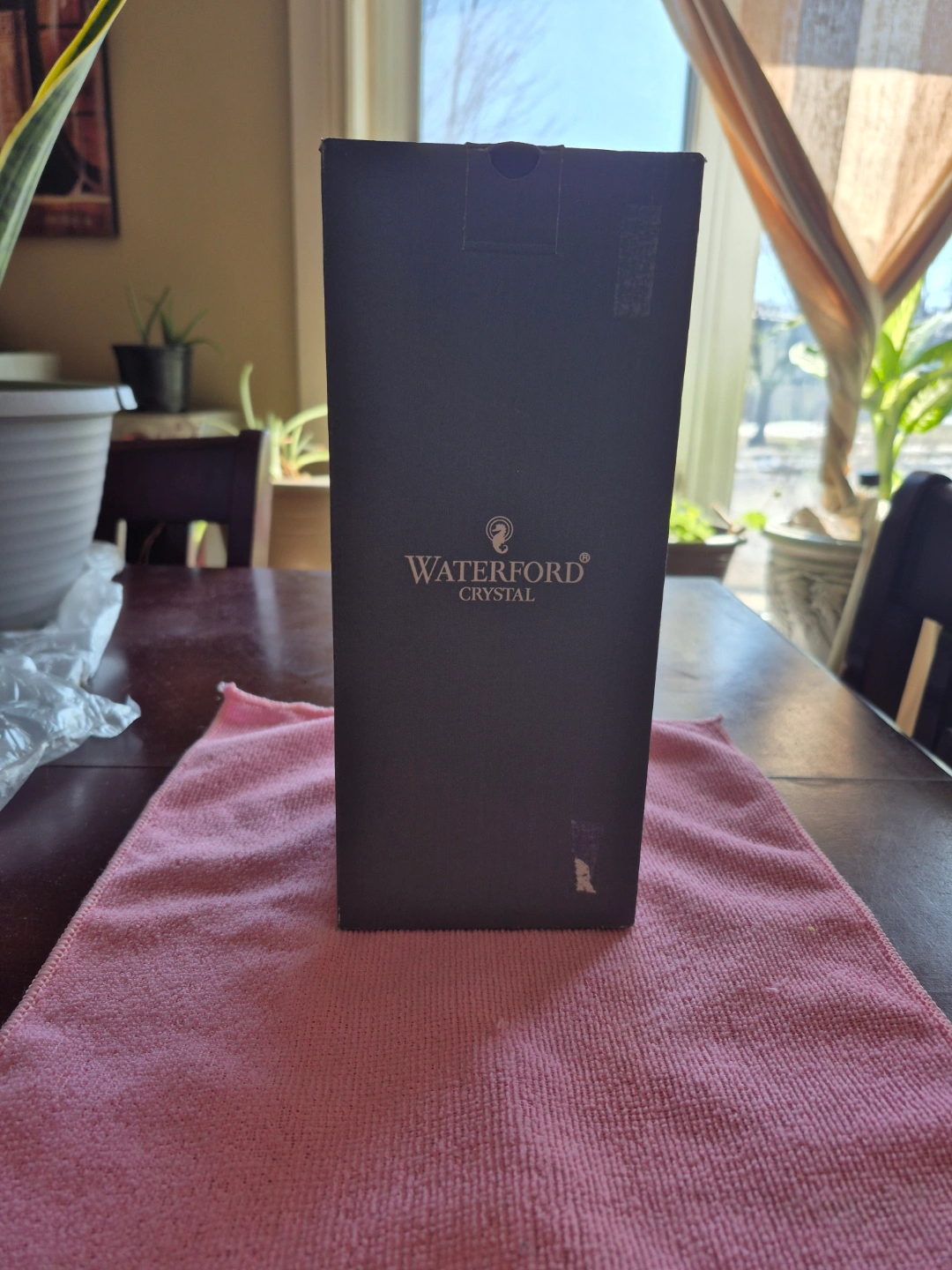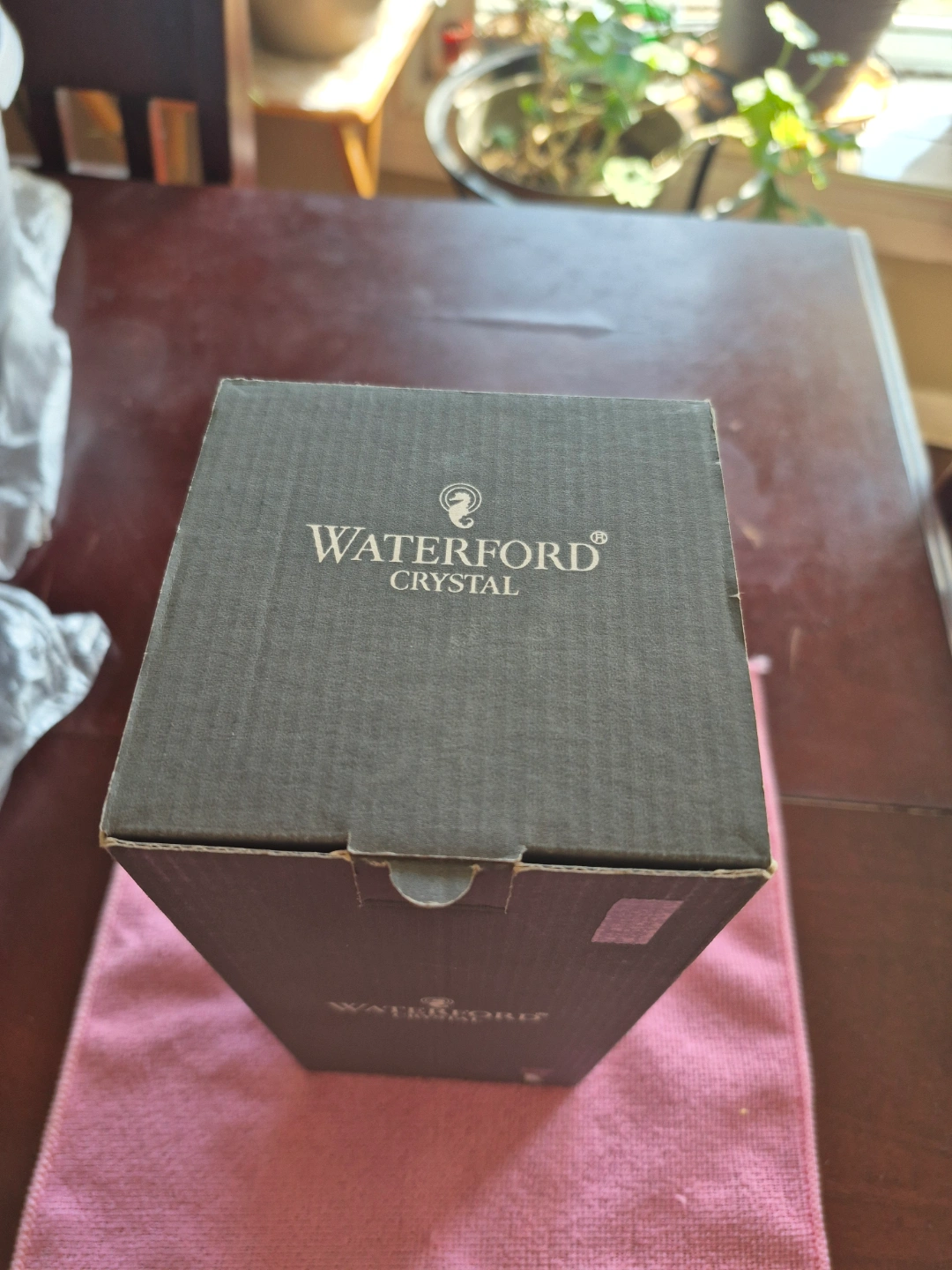 This is a brand New Waterford Crystal Vase, still in it's original packaging! Made in Slovania This elegant vace features a timeless design, perfect for displaying your favorite flowers or as a sophisticated decorative piece. Add a touch of luxury to your home with this exquisite Waterford Creation. 8 inches tall. similar Waterford crystal vases start at $150.