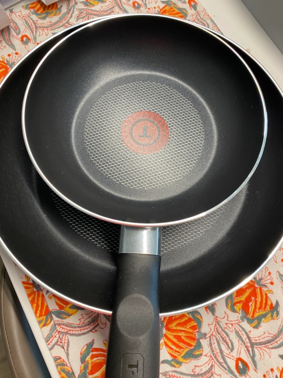 Two frying pans, 8 inch and 10.5 inch. Titanium non-stick. Suitable for all heat sources except induction. Hand wash recommended. Limited lifetime warranty.