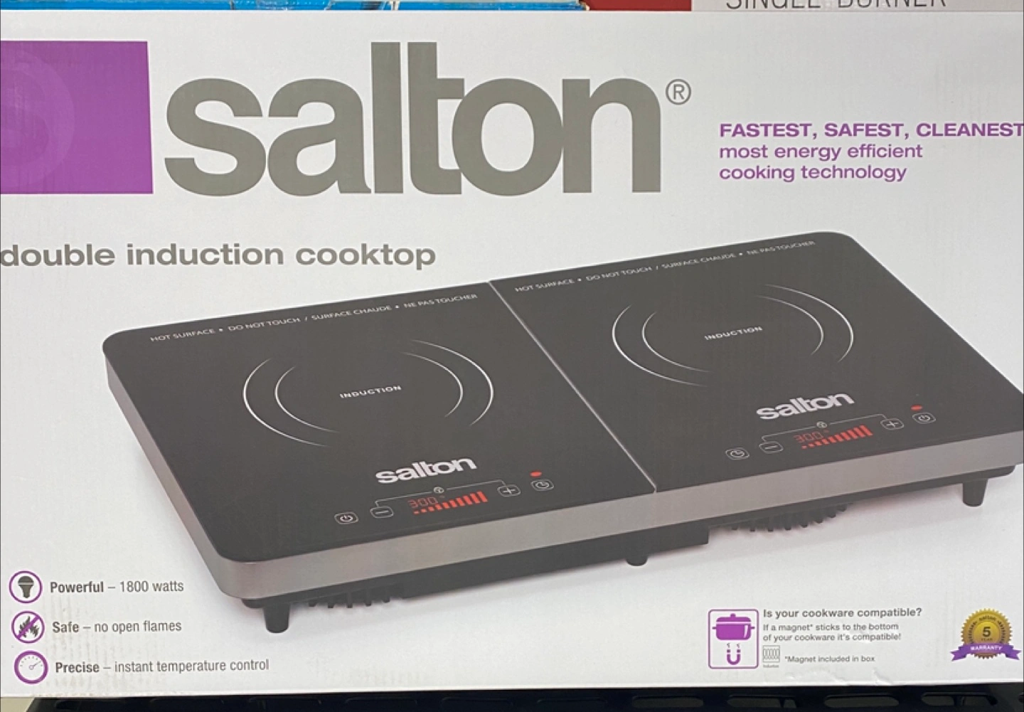Salton Double Induction Cooktop NEW in factory packaging The Salton portable induction cooktop features precise temperature control and is energy efficient. Specifications: * Faster than gas, coil and ceramic stoves * Safer - no open flames * Precise temperature control * Power - 1800 watts * Cool touch * LED display with 7 function settings * Timer - up to 3 hours with auto shut-off and audible signal. $188. 204.661.4750.