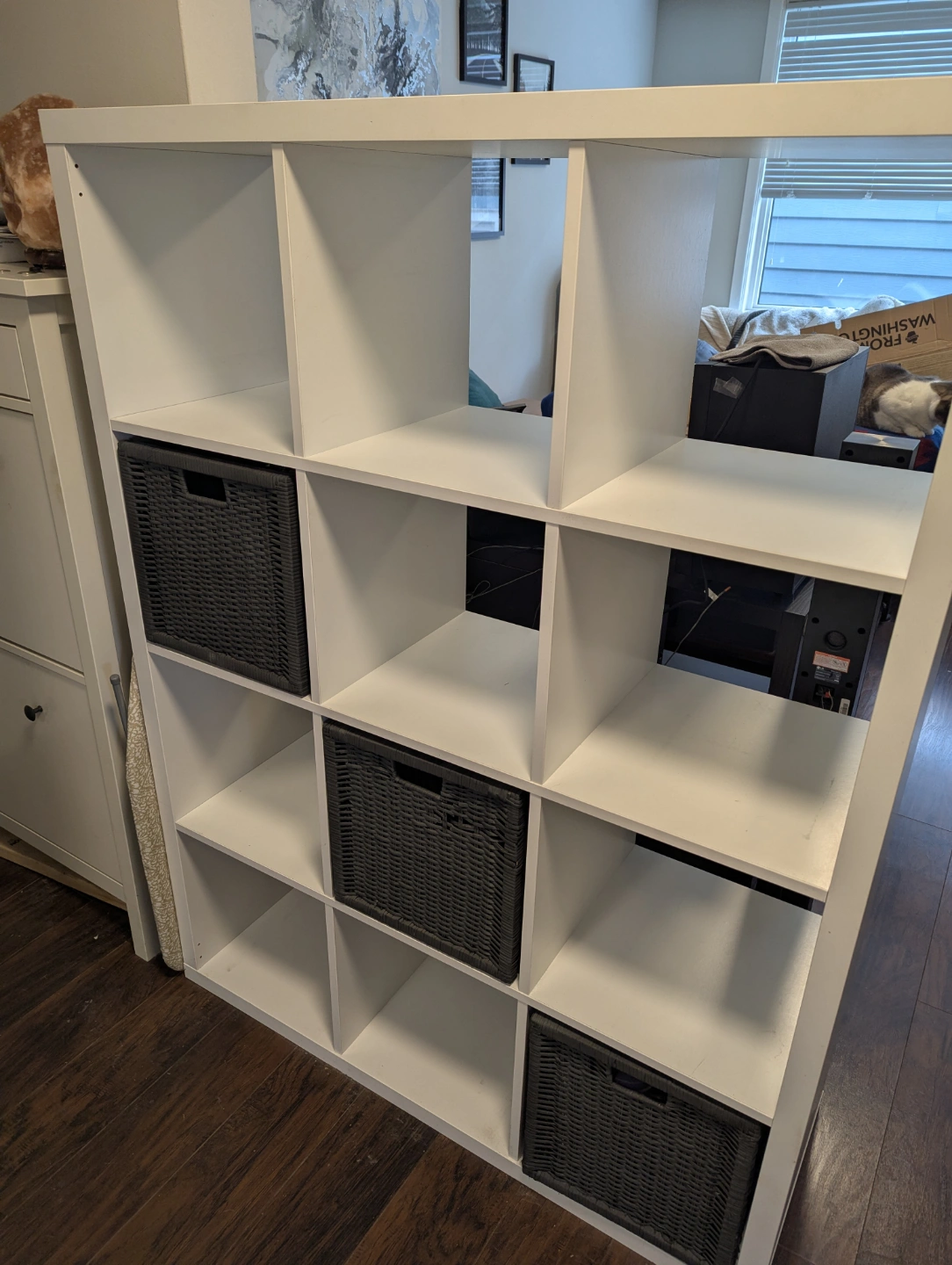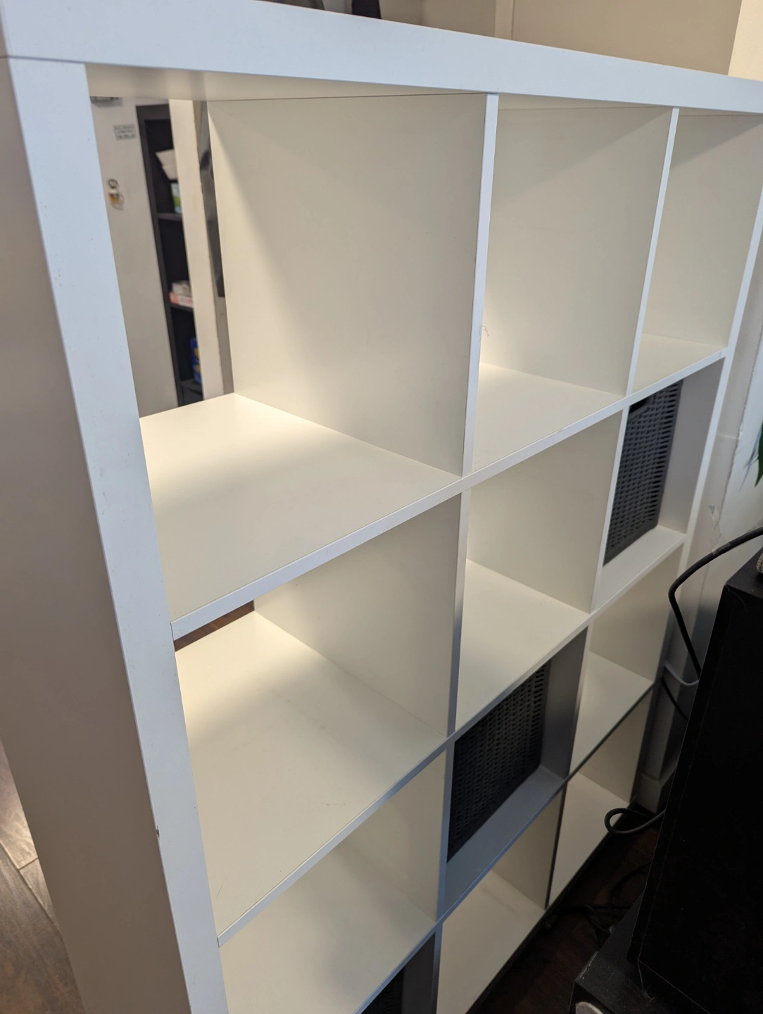 White Kallax shelving unit. Twelve cubicles. Includes three grey woven storage boxes. Good condition. Some minor wear.