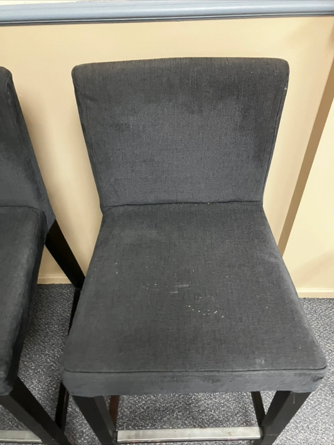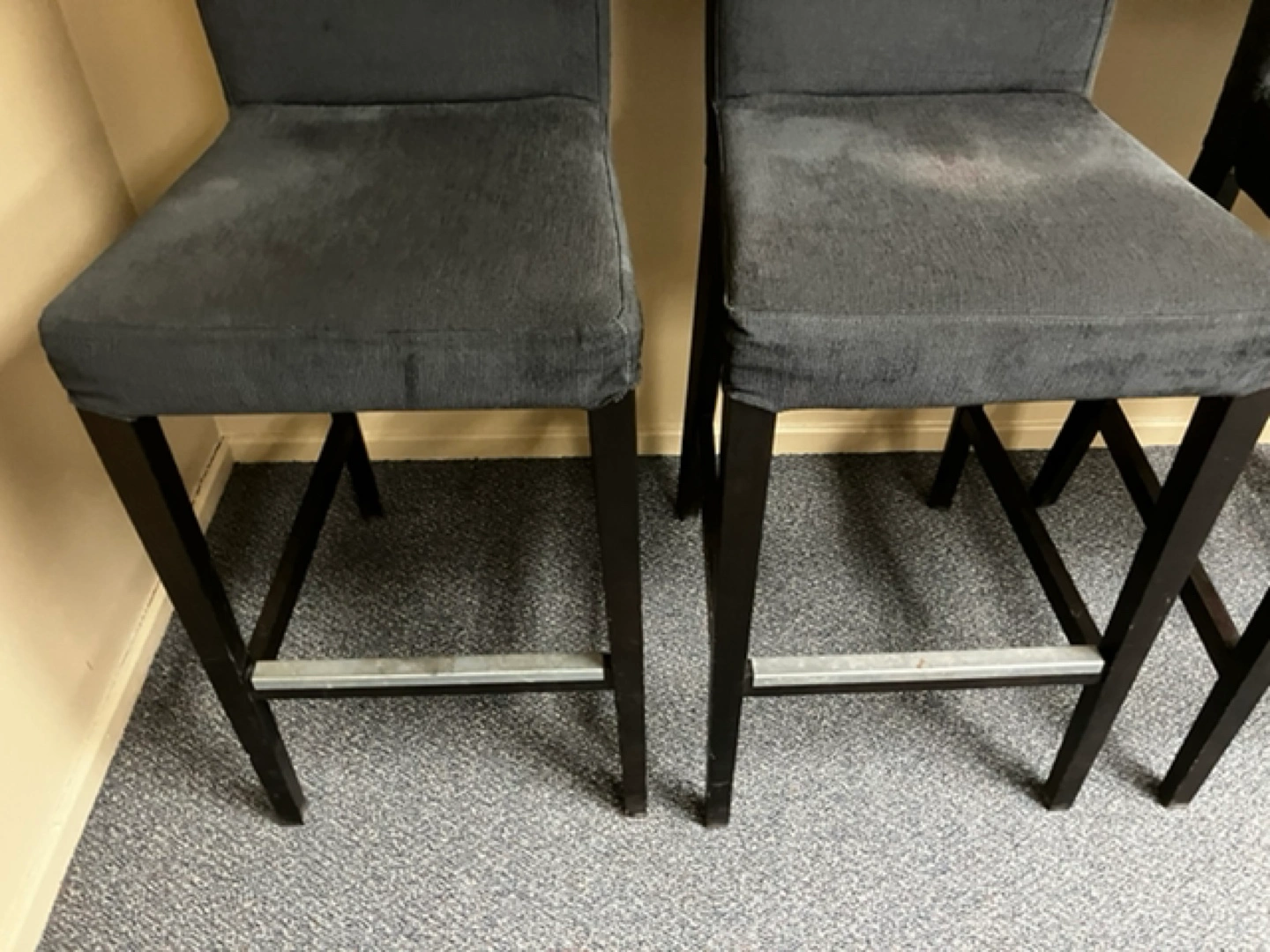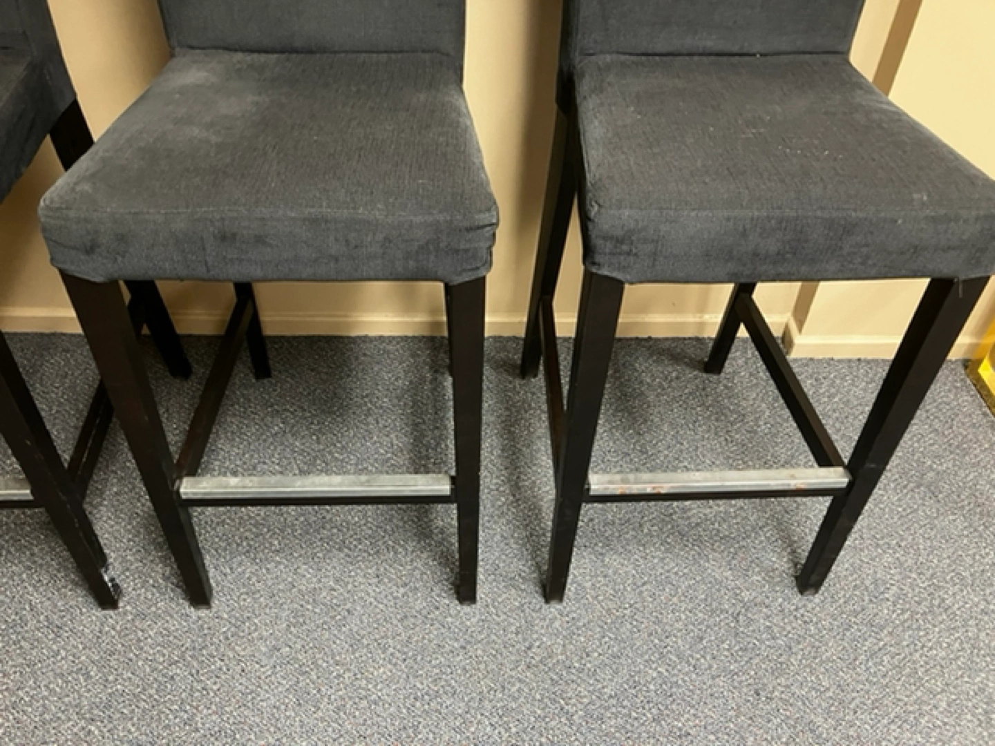 Four dark grayish blue fabric bar stools. Black wooden legs and a metal footrest. Some minor staining visible. Pick up at Carling and Pinecrest.