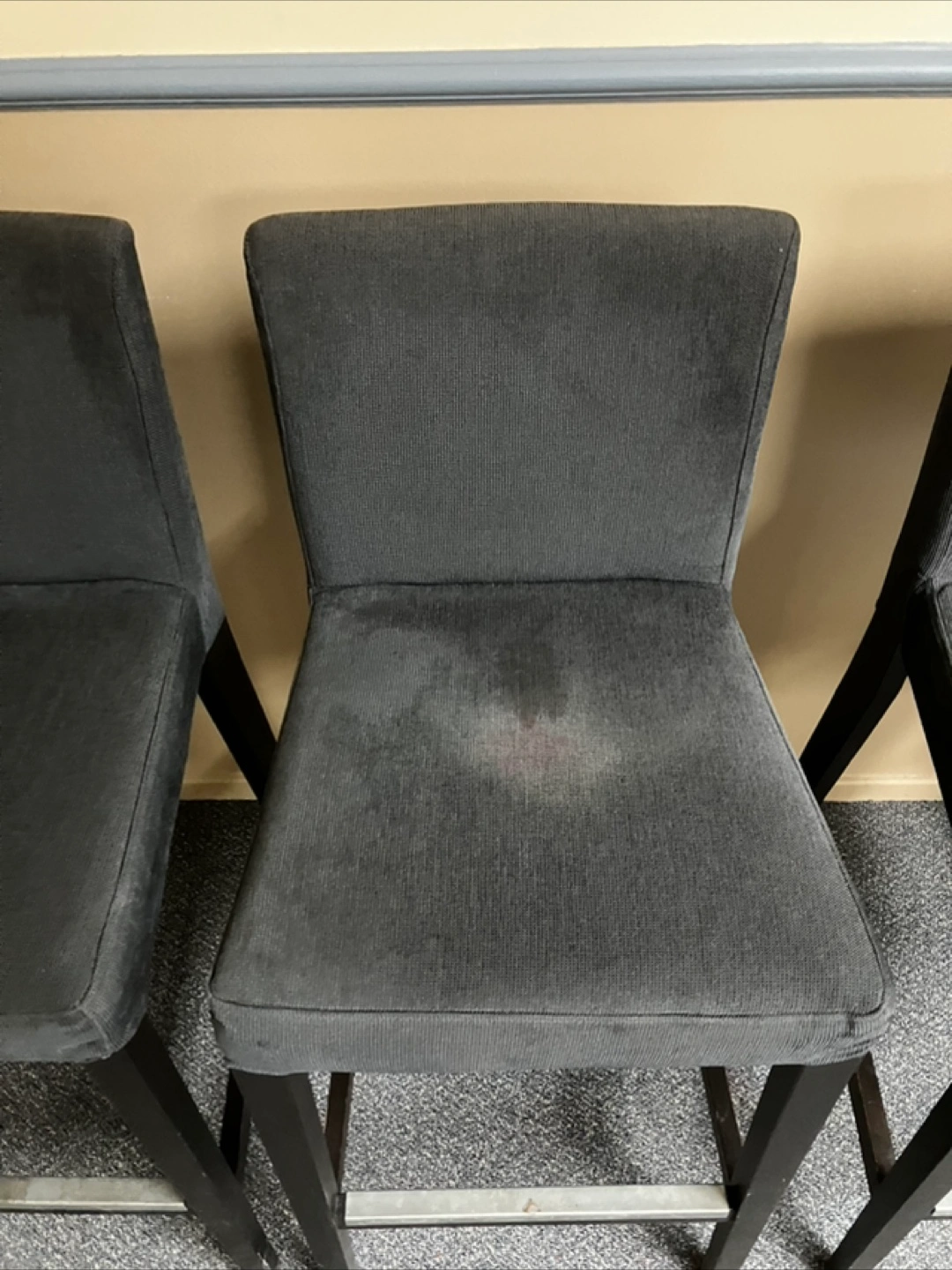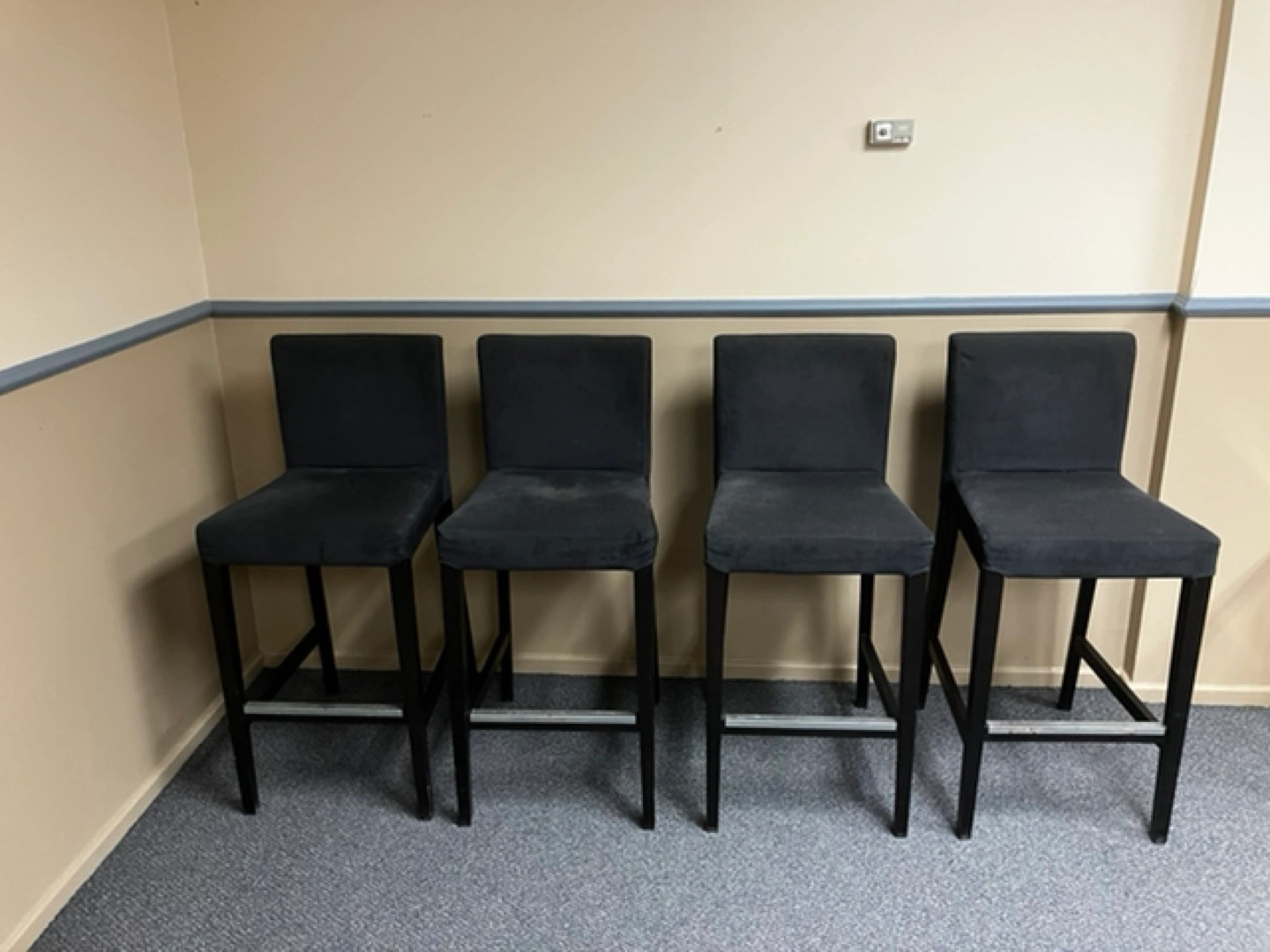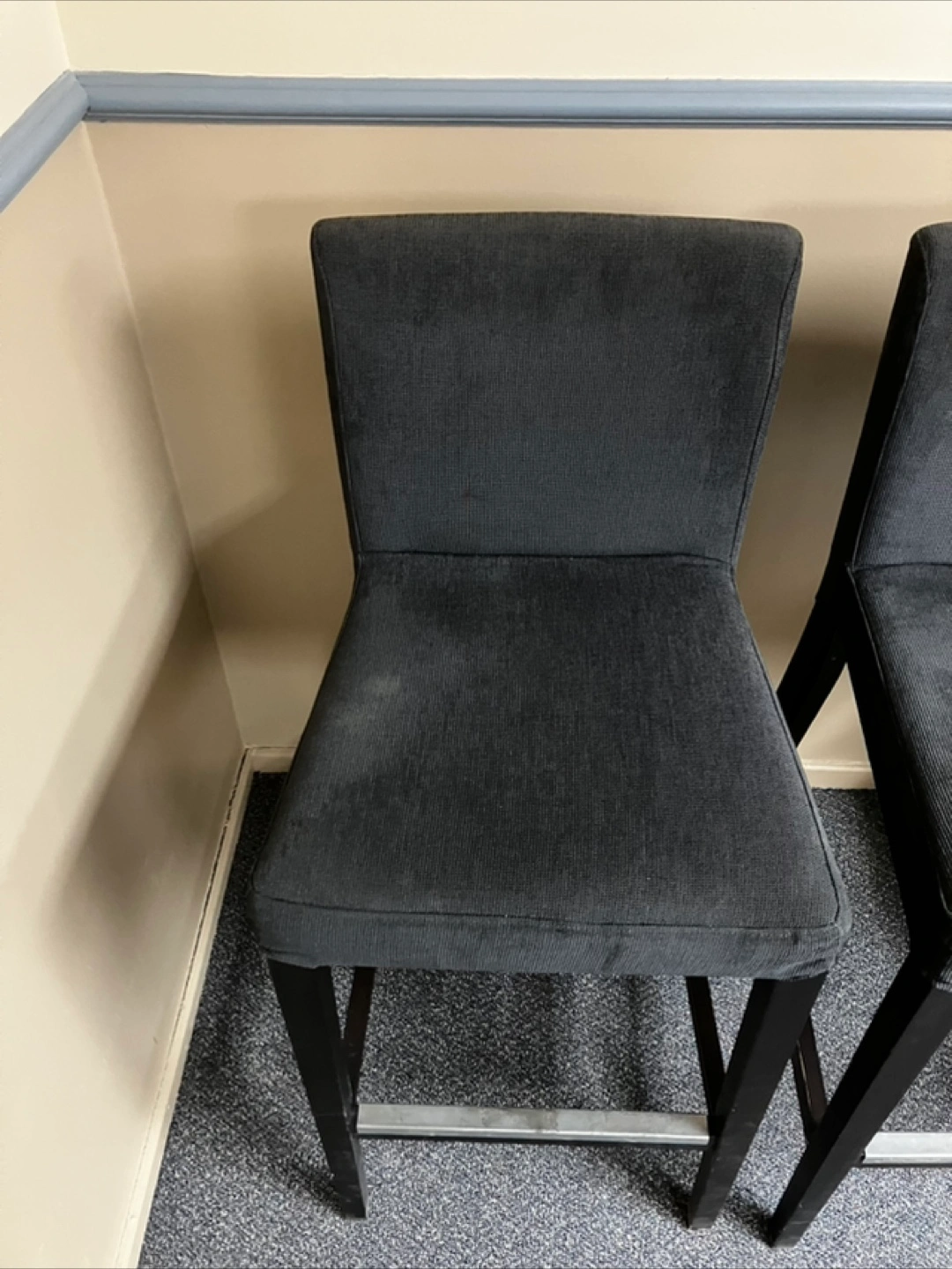 Four dark grayish blue fabric bar stools. Black wooden legs and a metal footrest. Some minor staining visible. Pick up at Carling and Pinecrest.
