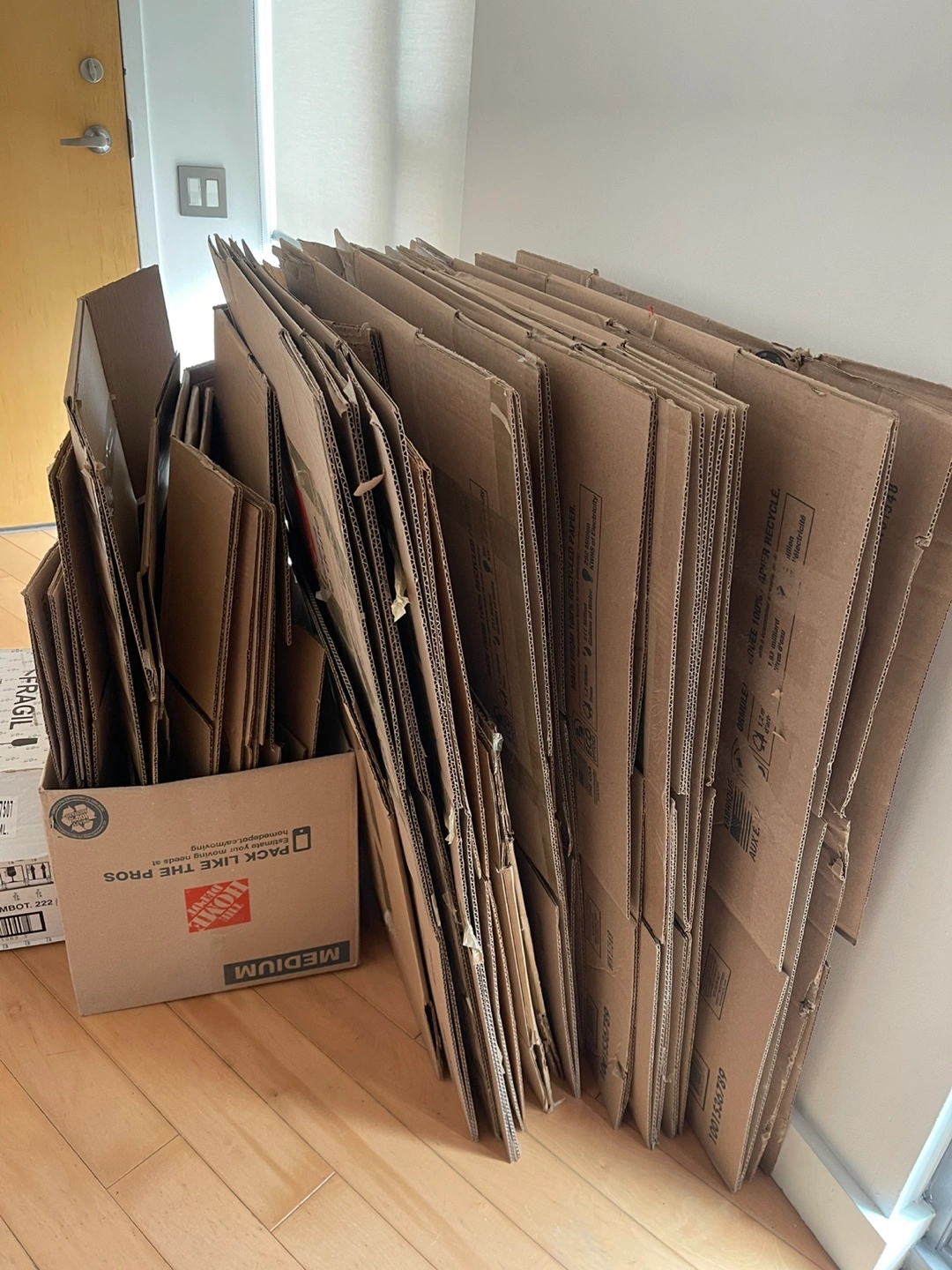 Large quantity of used cardboard moving boxes.