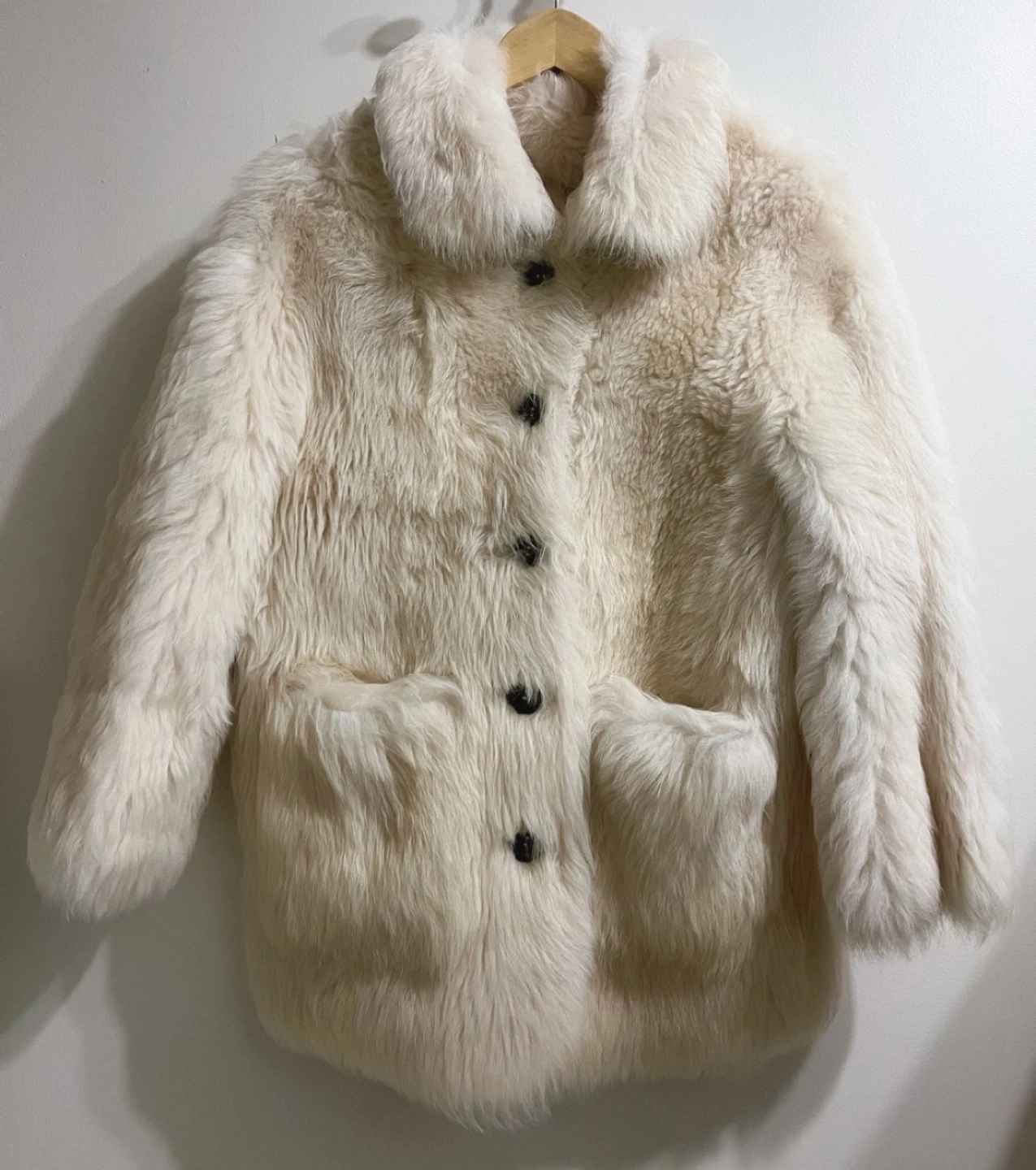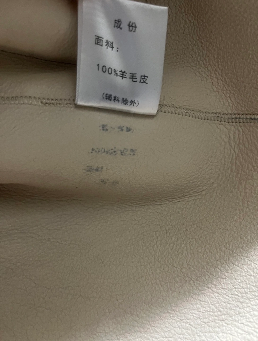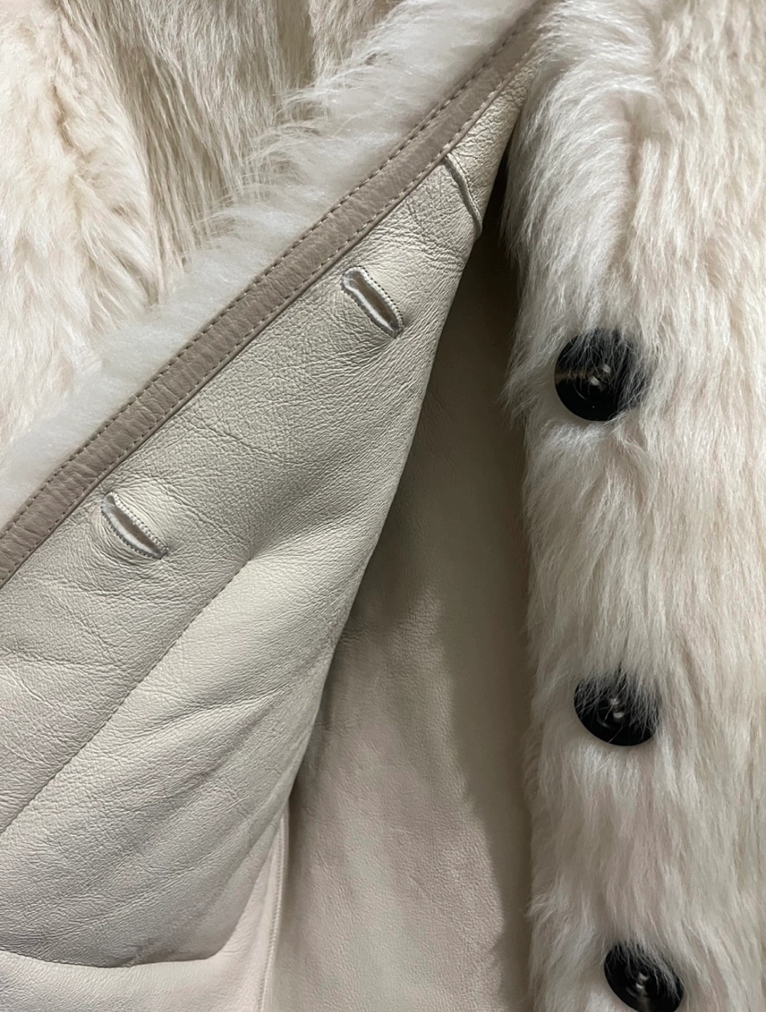 Beige sheepskin coat with black buttons. The sheepskin coat is thick and warm.