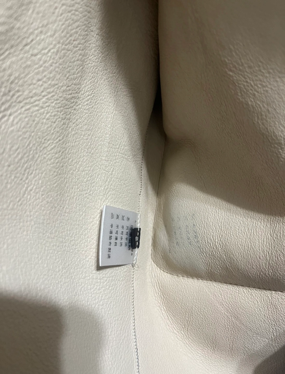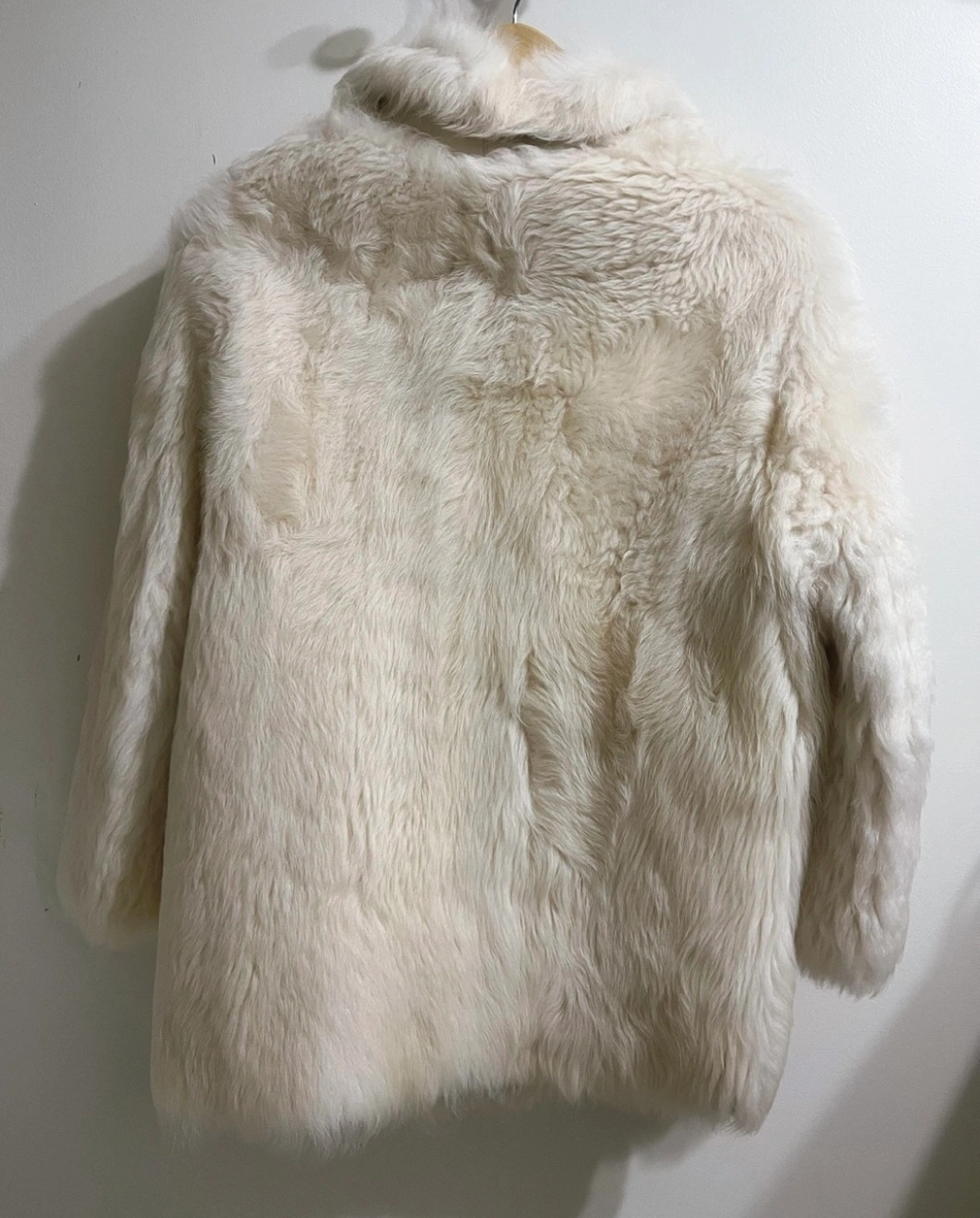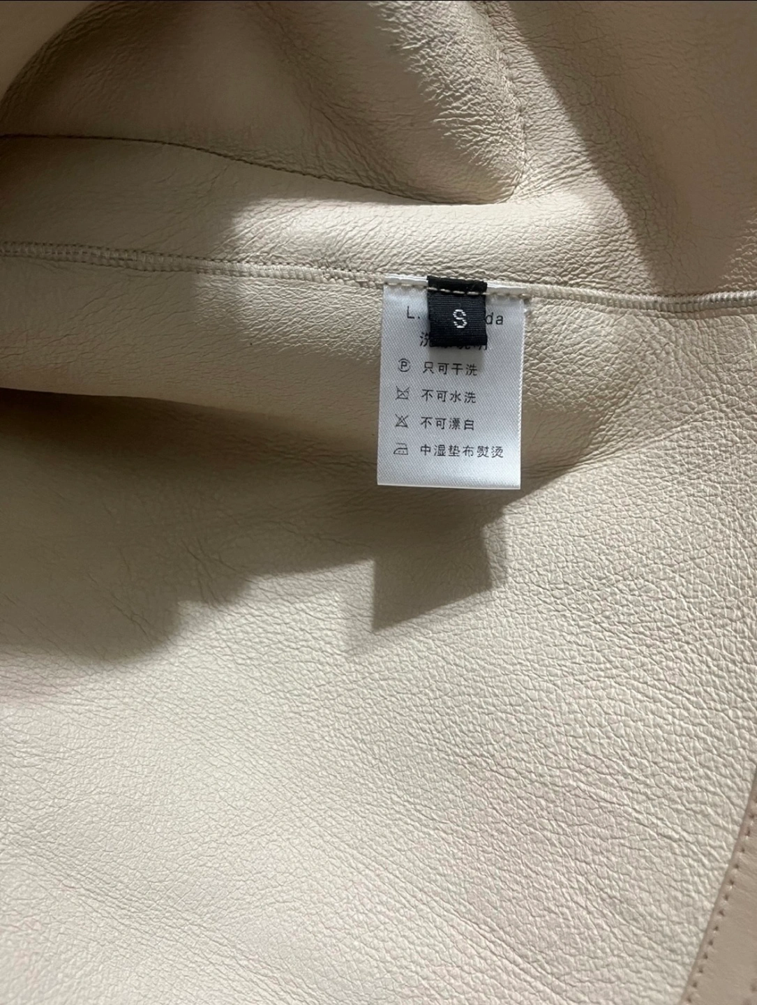 Beige sheepskin coat with black buttons. The sheepskin coat is thick and warm.