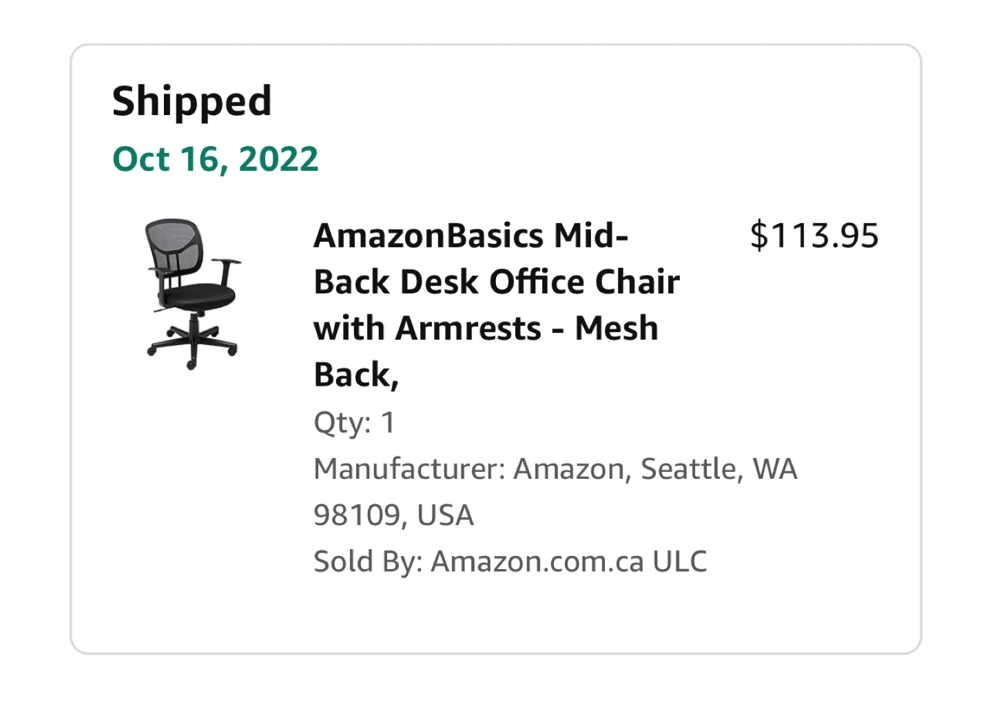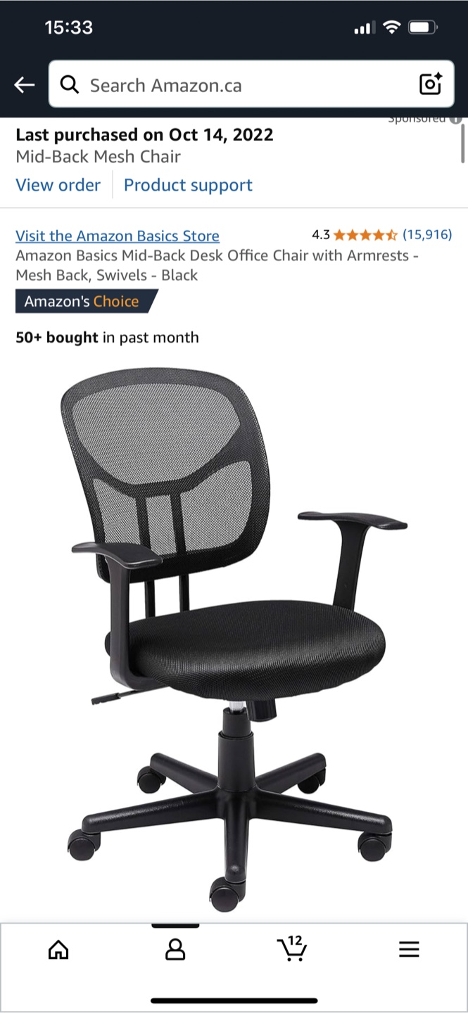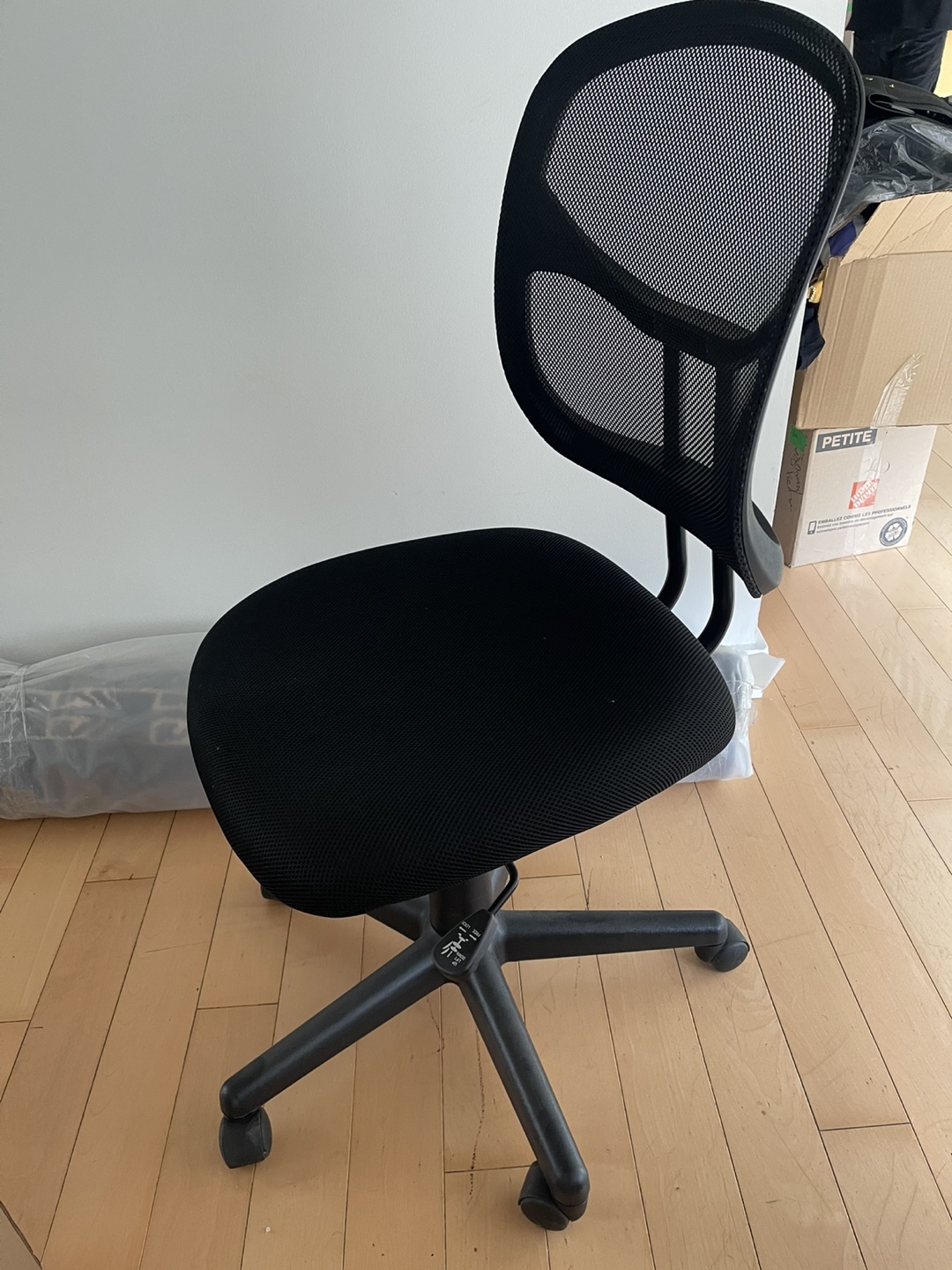 Black mesh office chair. Five-star base with rolling casters. Mid-back design. Suitable for home or office use. Purchased in 2022 and used tor 2 weeks before relocating to Europe. It has been in secure storage since then. Originally bought at $114. Current SRP is $150 (sale at $135). #inflation Get your pre-tariff office chair for $75 obo, pick up only.