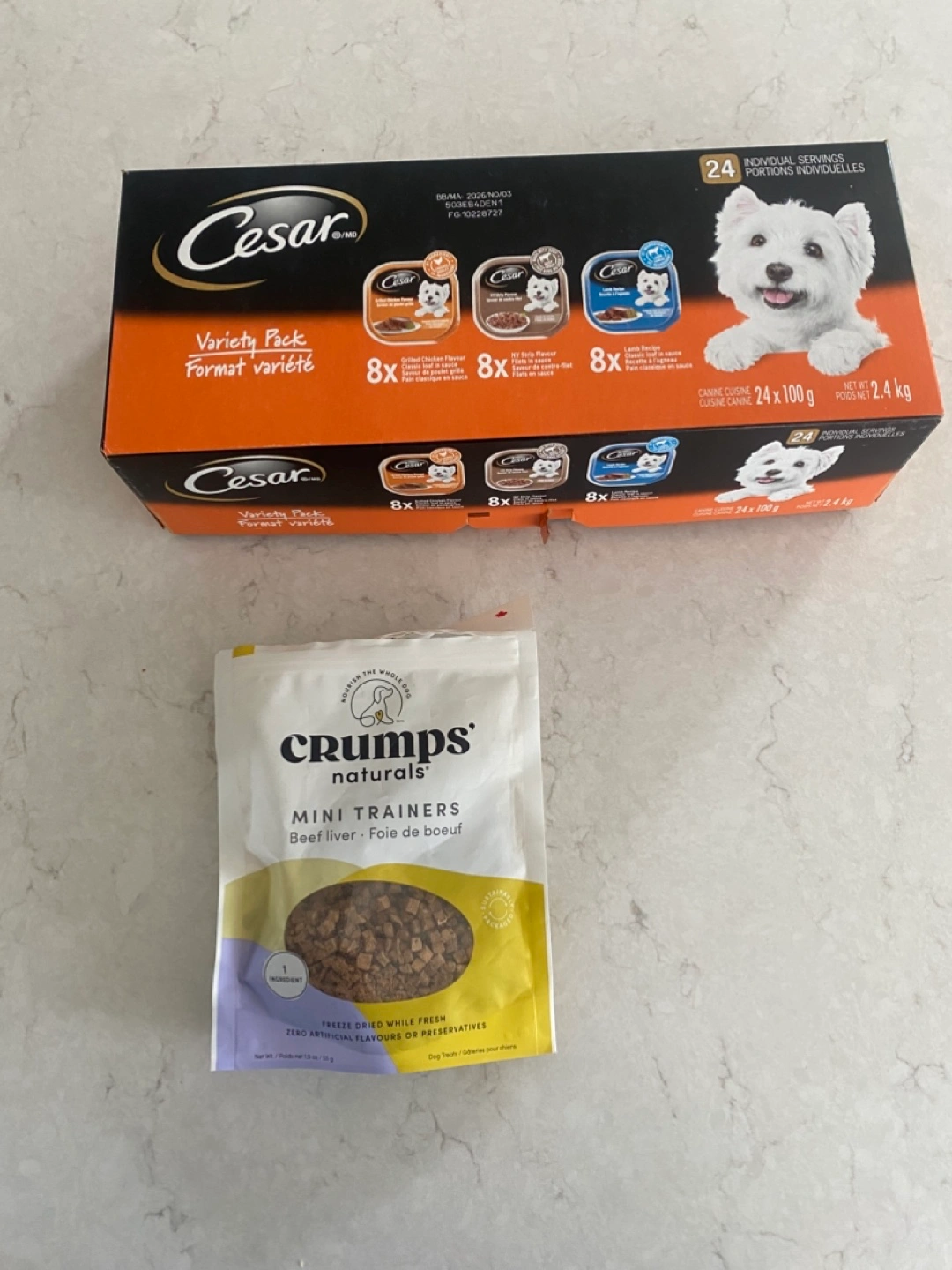 We got a dog and the vet told us these items weren’t suitable for the breed! Fluffy dog bed, great for small dogs. Variety pack of Cesar wet dog food (2 cans missing from 24 pack) and a bag of Crumps naturals mini trainers.