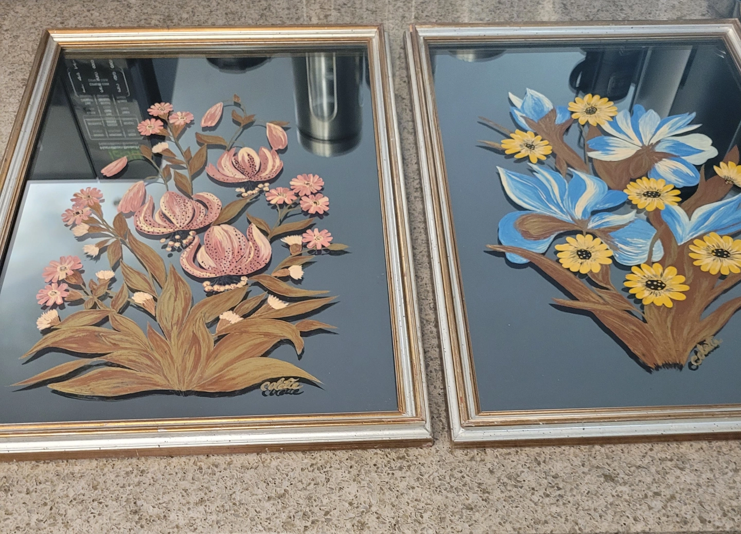 Pair of framed floral mirror art pieces. Features pink and blue flowers on a dark background. Artist signature visible. Unique vintage decor.