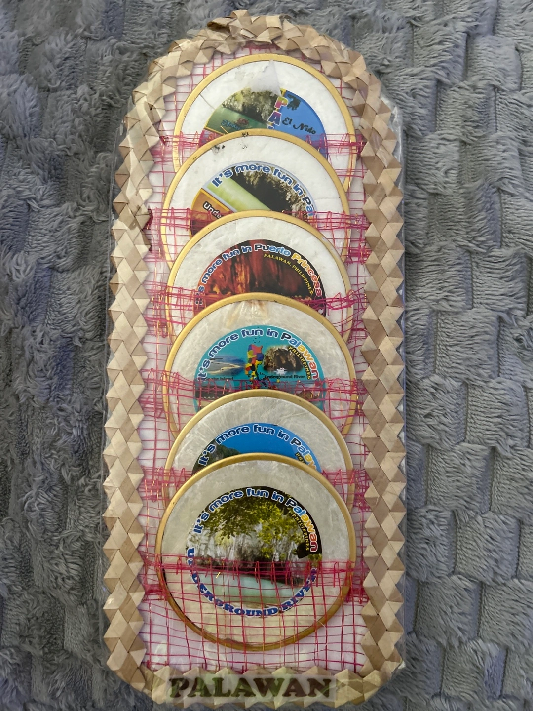 396Set of six Palawan coasters. Unique design. Made from Capiz shells. Comes in a woven package. Perfect souvenir or gift.