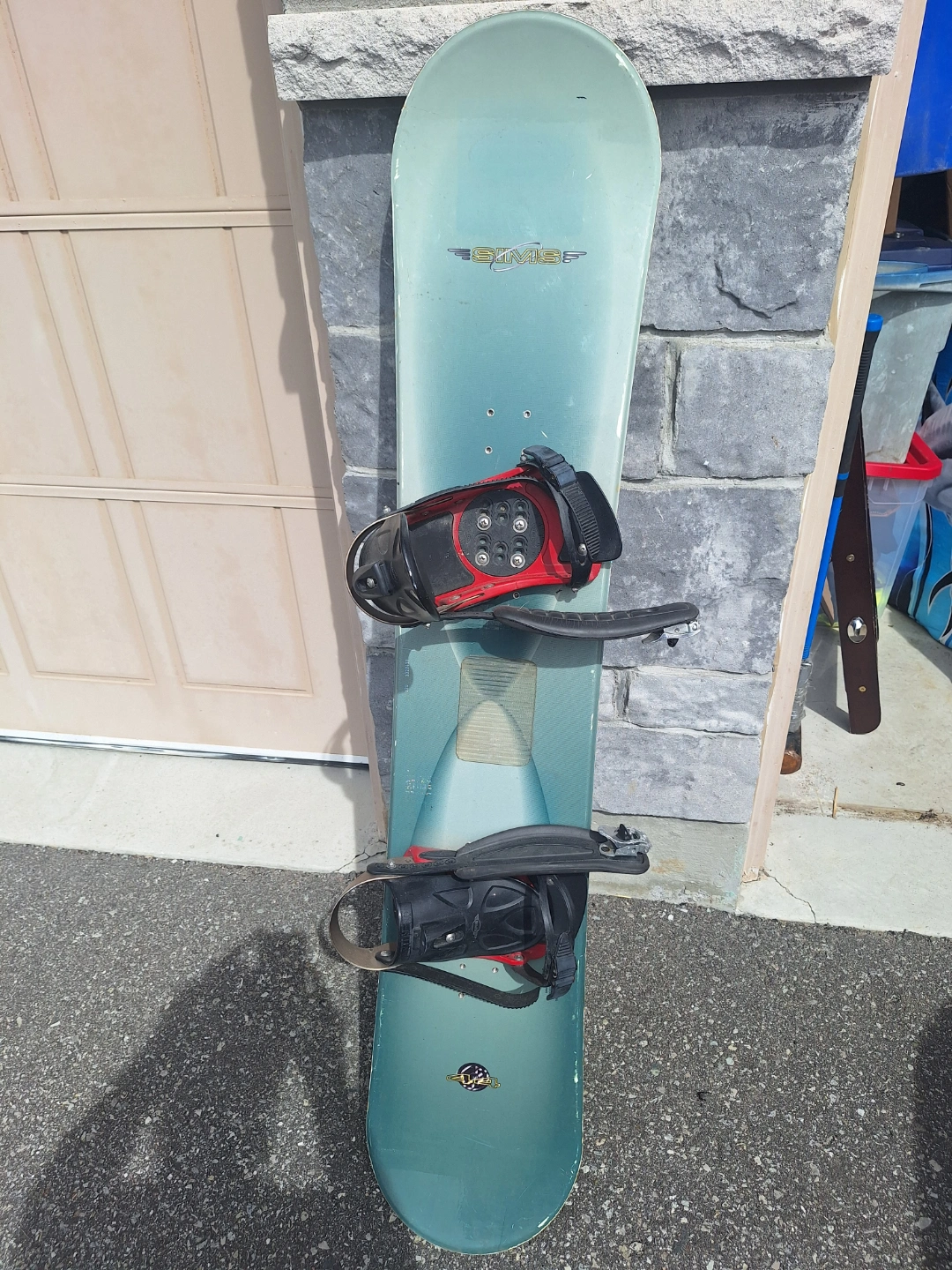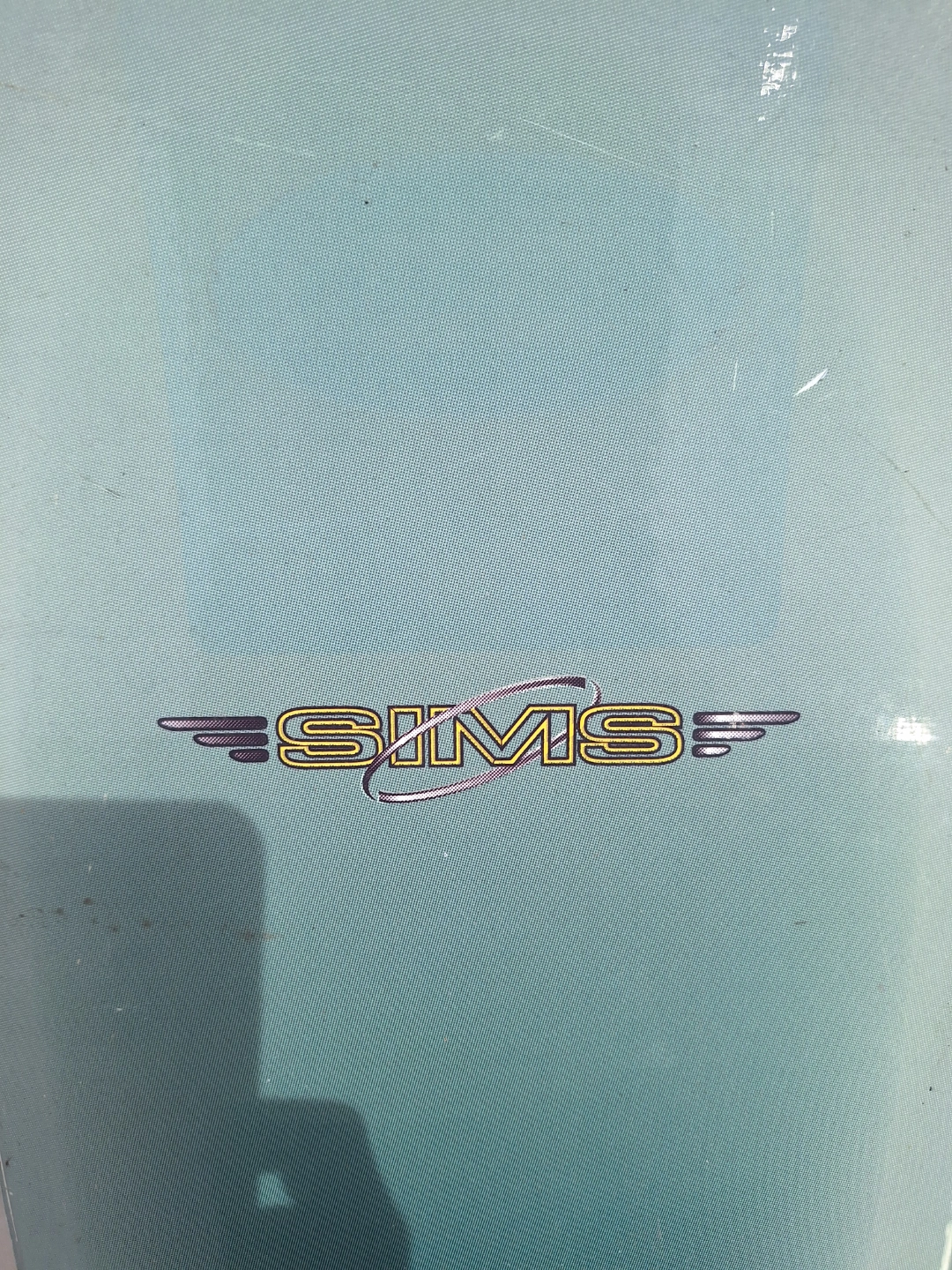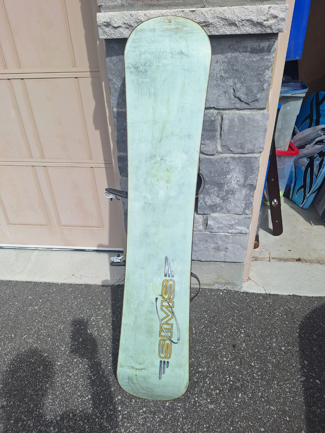 Used Sims snowboard. Teal coloured. Includes bindings. Shows wear from use.