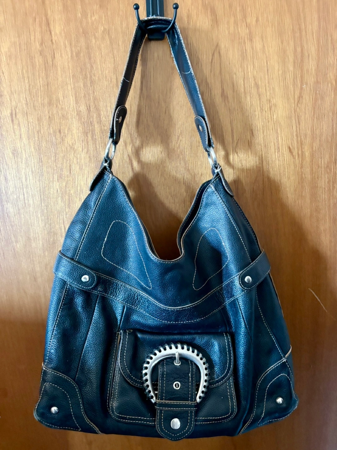 Large black leather hobo bag. Features silver-toned hardware and stitching accents. Multiple compartments. Stylish and functional.