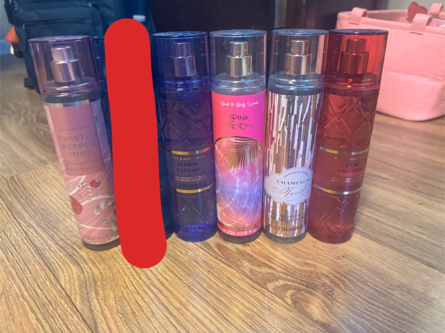 5 Bath & Body Works fragrance mists. Includes Twisted Peppermint , Floral Fantasy, Pink tie Dye, champagne toast and Pink Obsessed
