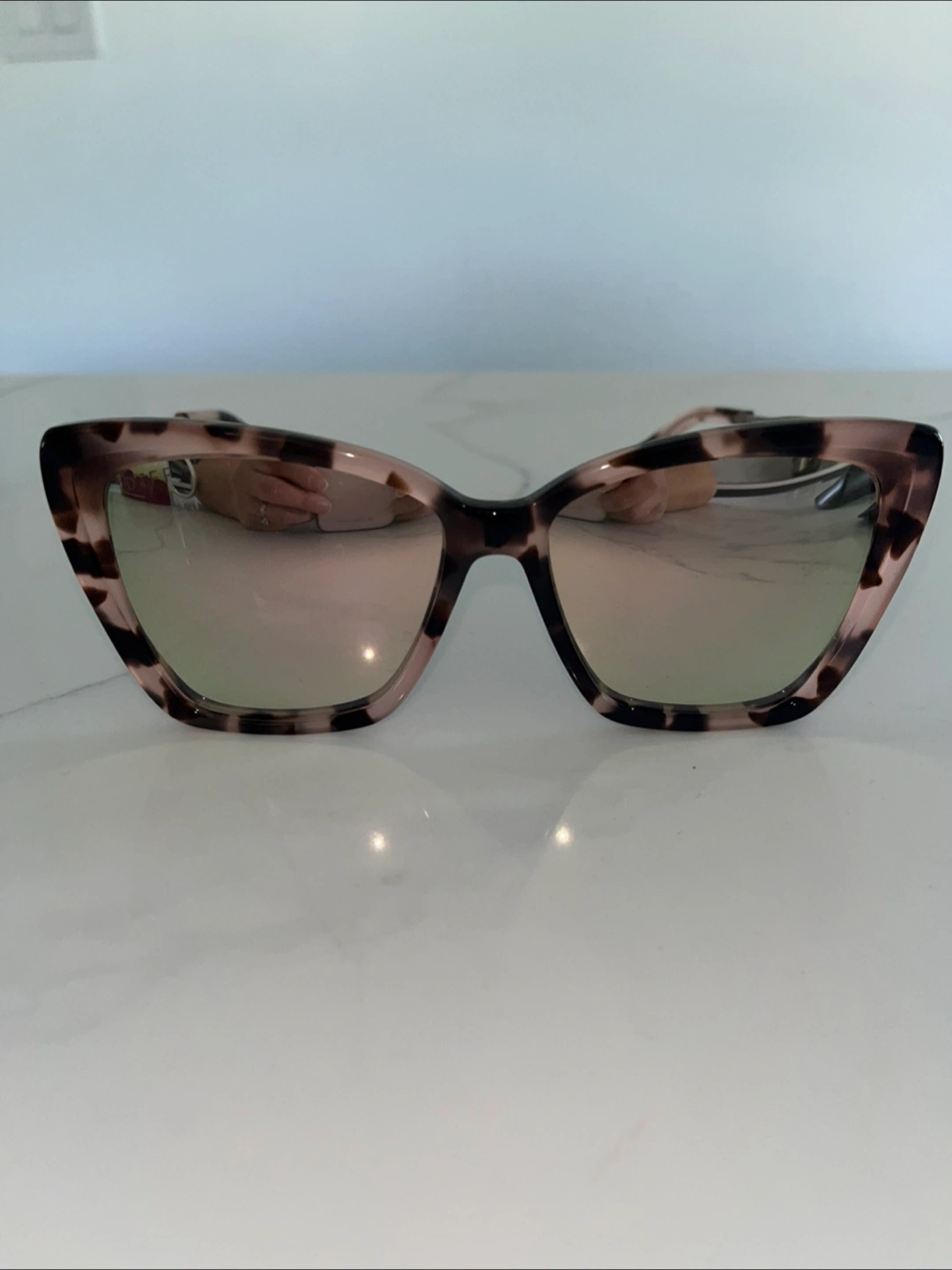 Women's sunglasses. Tortoise frames with Rose gold mirrored lenses. Metal arms. Includes soft case.