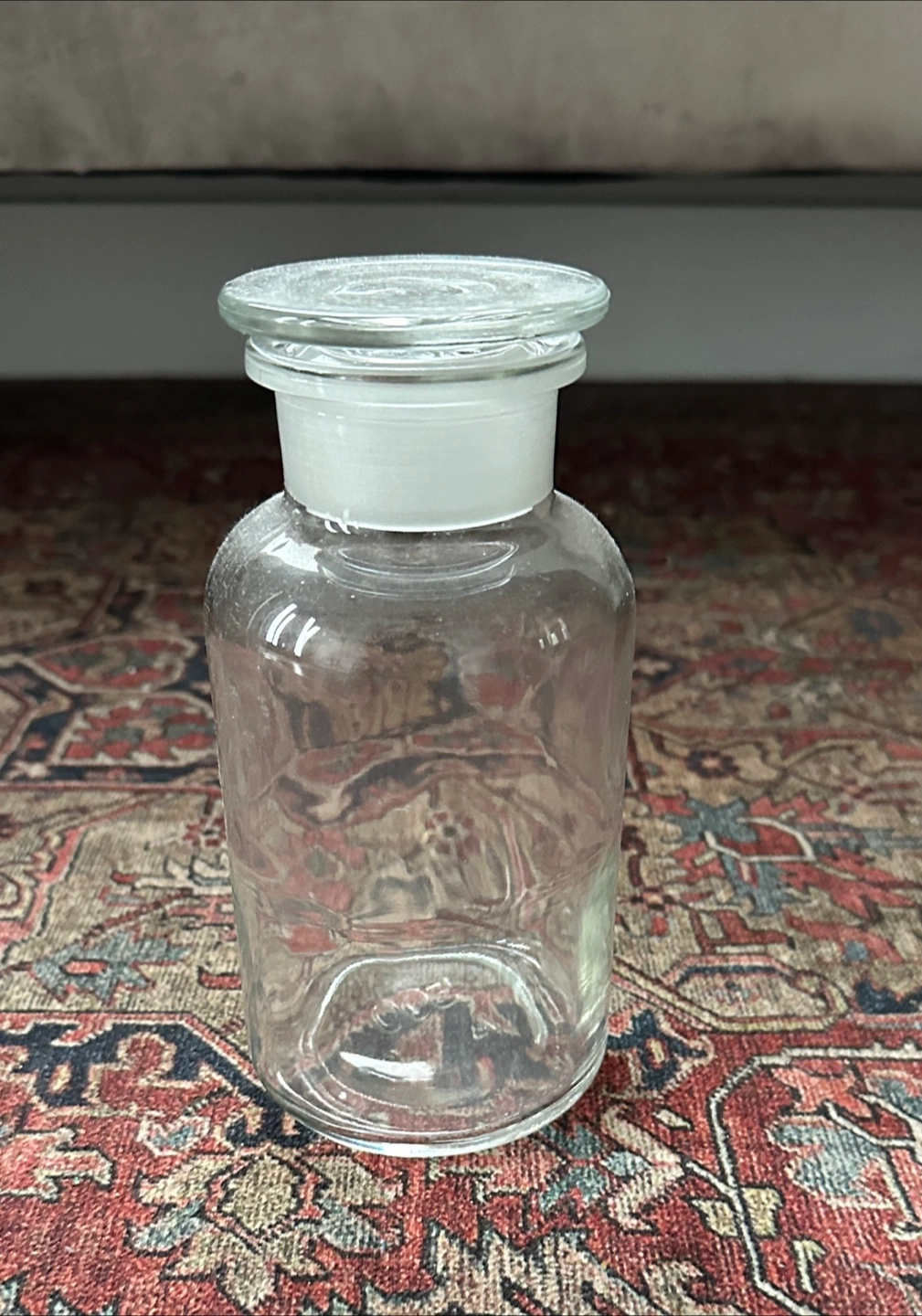 292Clear glass jar, perfect for storage or display. Features a glass stopper. Vintage style. 7 inches tall - orginally purchased in the UK $10