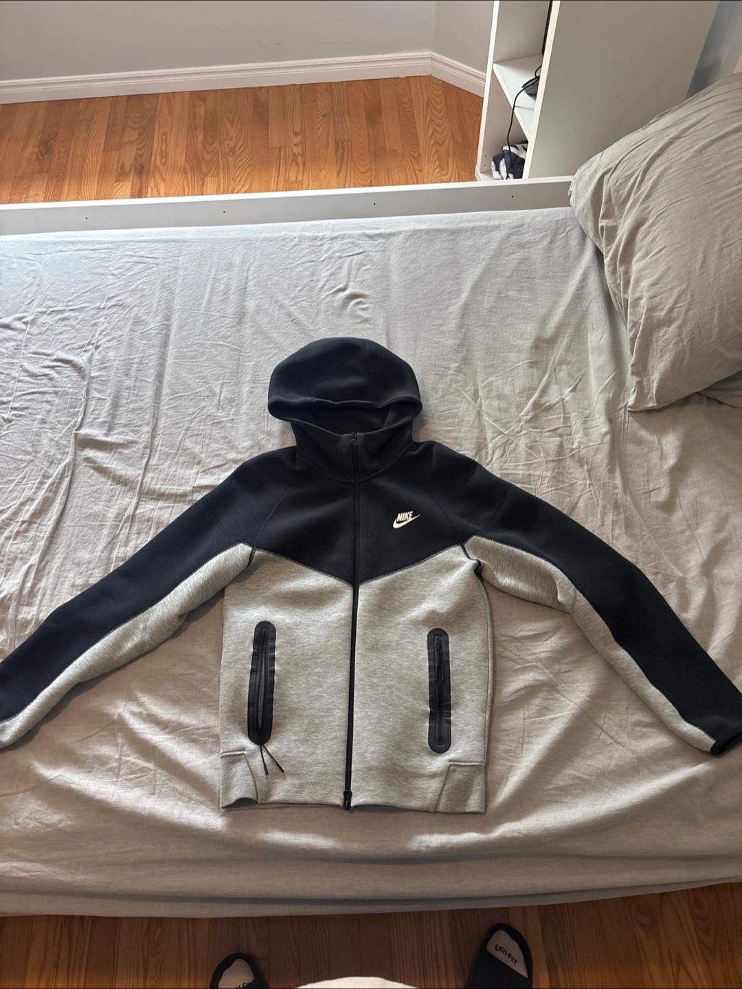 Grey and black colour block design. Small size. Full zip closure. Attached hood. Two zippered pockets. Made in Cambodia.