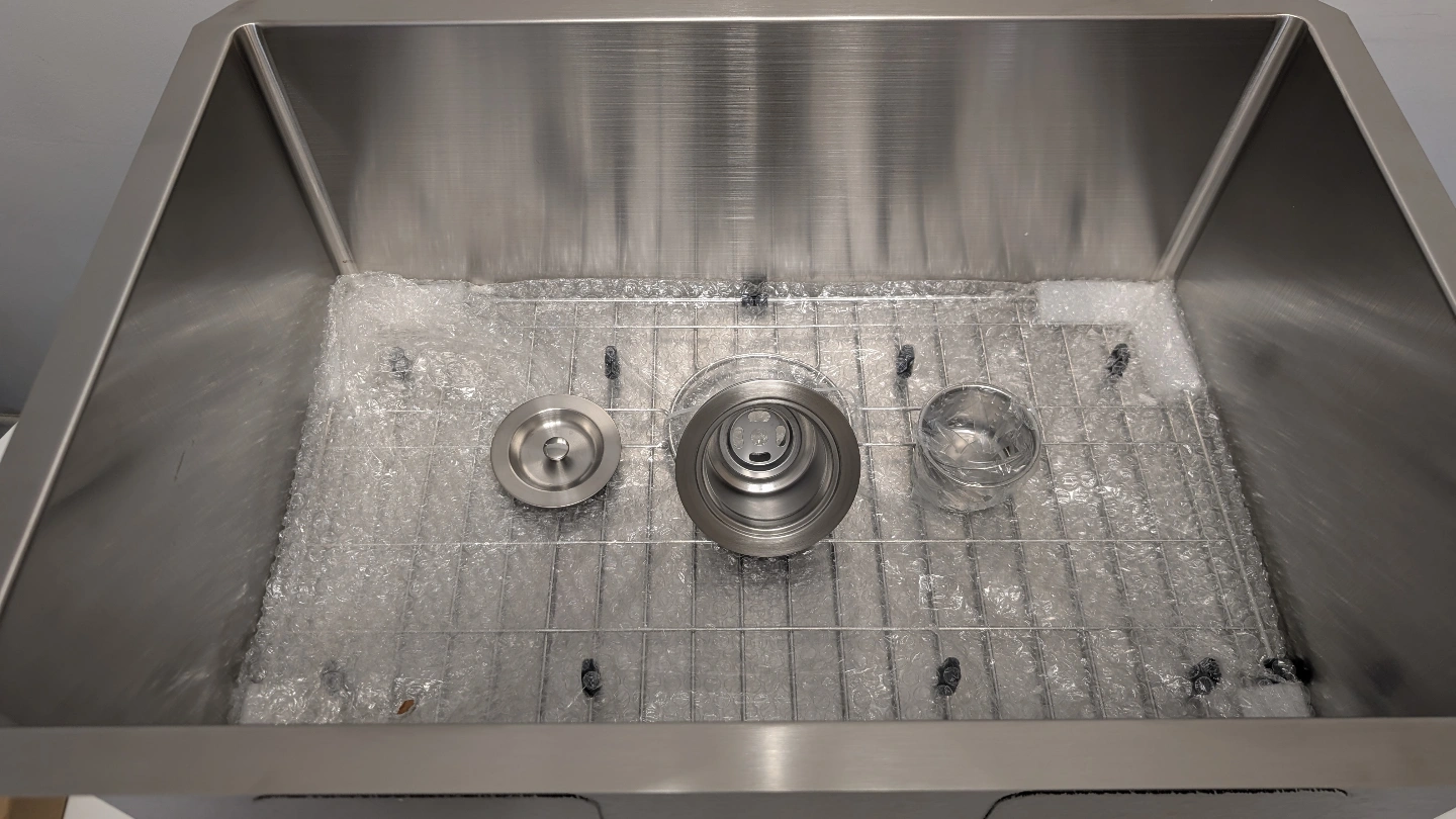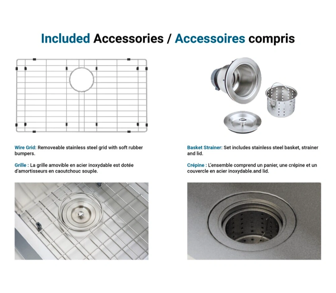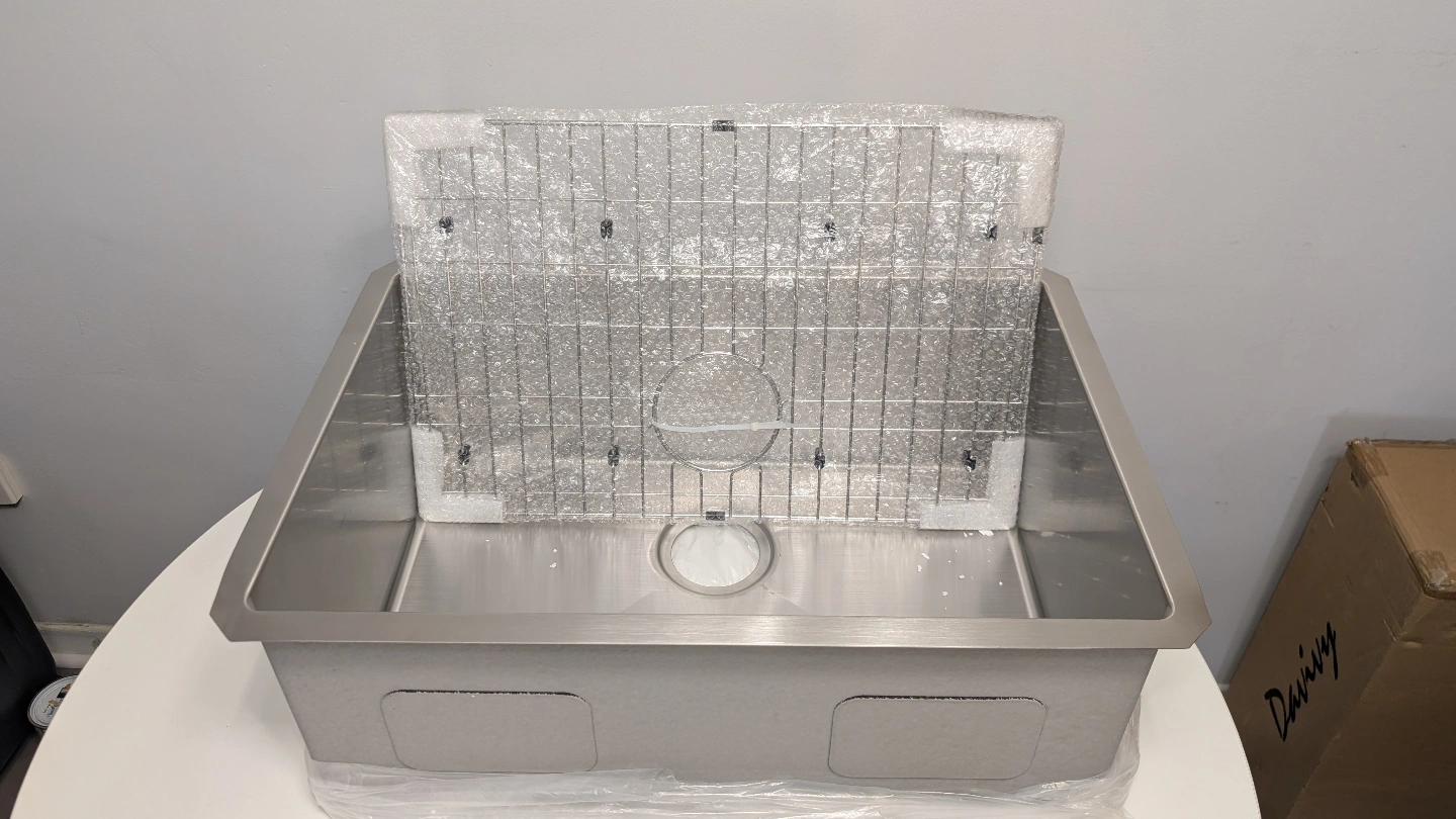 Pelham & White Bryn 16-Gauge Stainless Steel 26 inch Single Bowl Undermount Kitchen Sink with Bottom Grid and Drain. Brand new, never installed. Includes wire grid, basket strainer, and lid. Soft rubber bumpers on grid. Modern design. Excellent condition. $494 plus tax at Home Depot, or get it from me for $400!