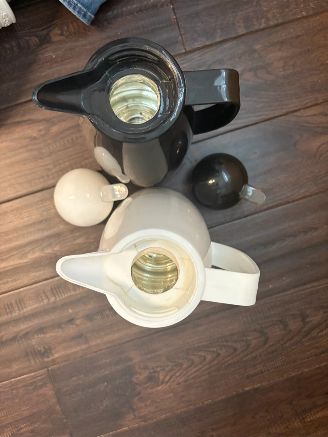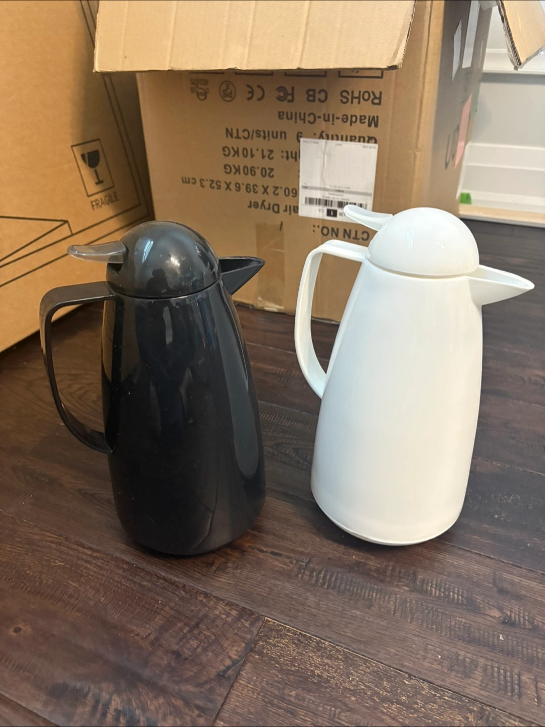 Pair of thermal coffee or tea pitchers. Penguin design. One black, one white. Both insulated, Good for keeping beverages hot or cold.