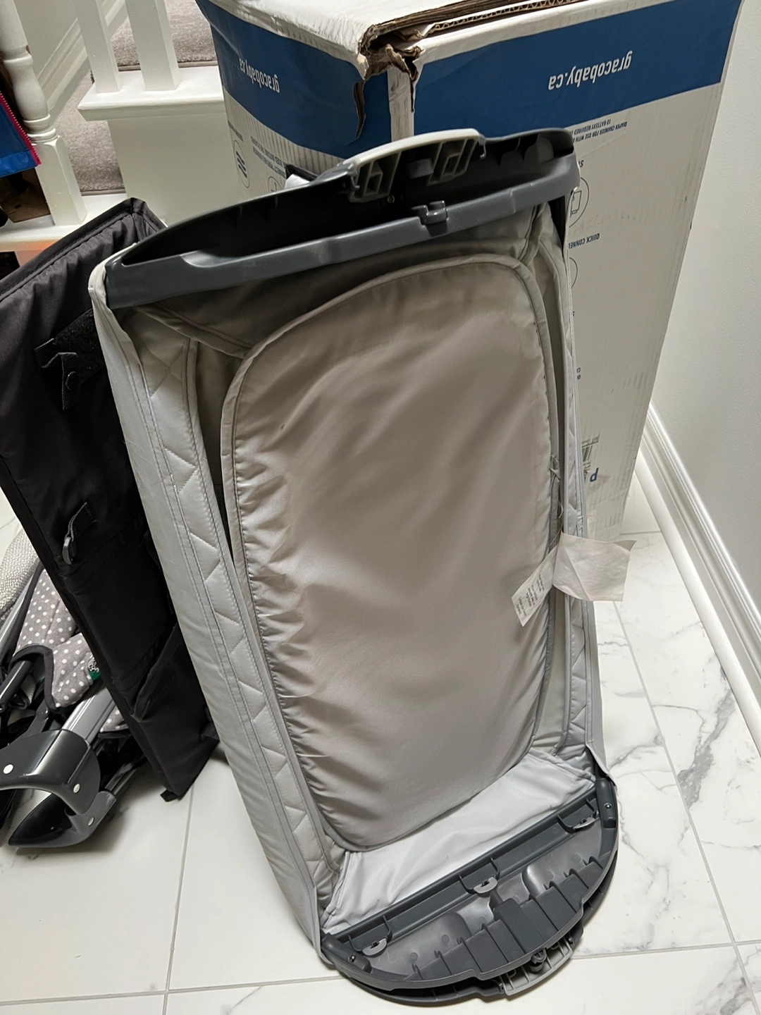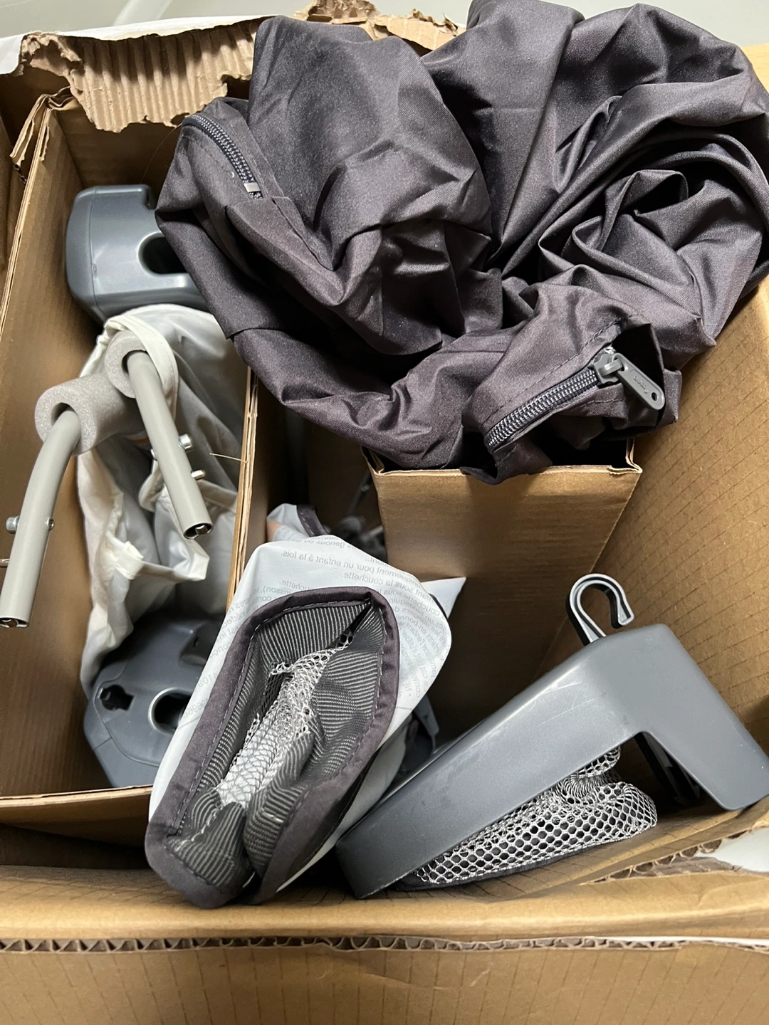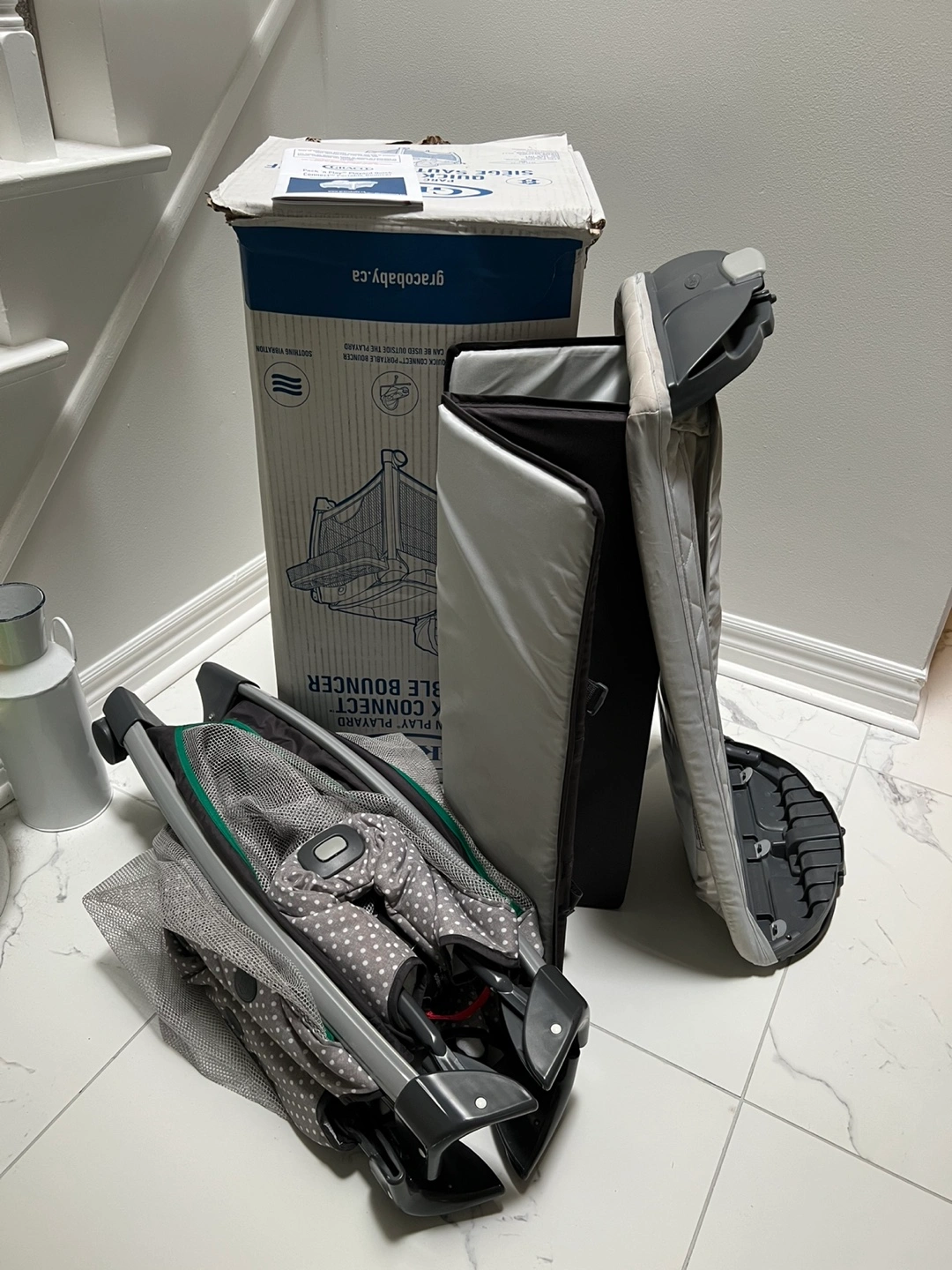15Grey and green playard. Includes bouncer. Some assembly required. Used, but in good condition.