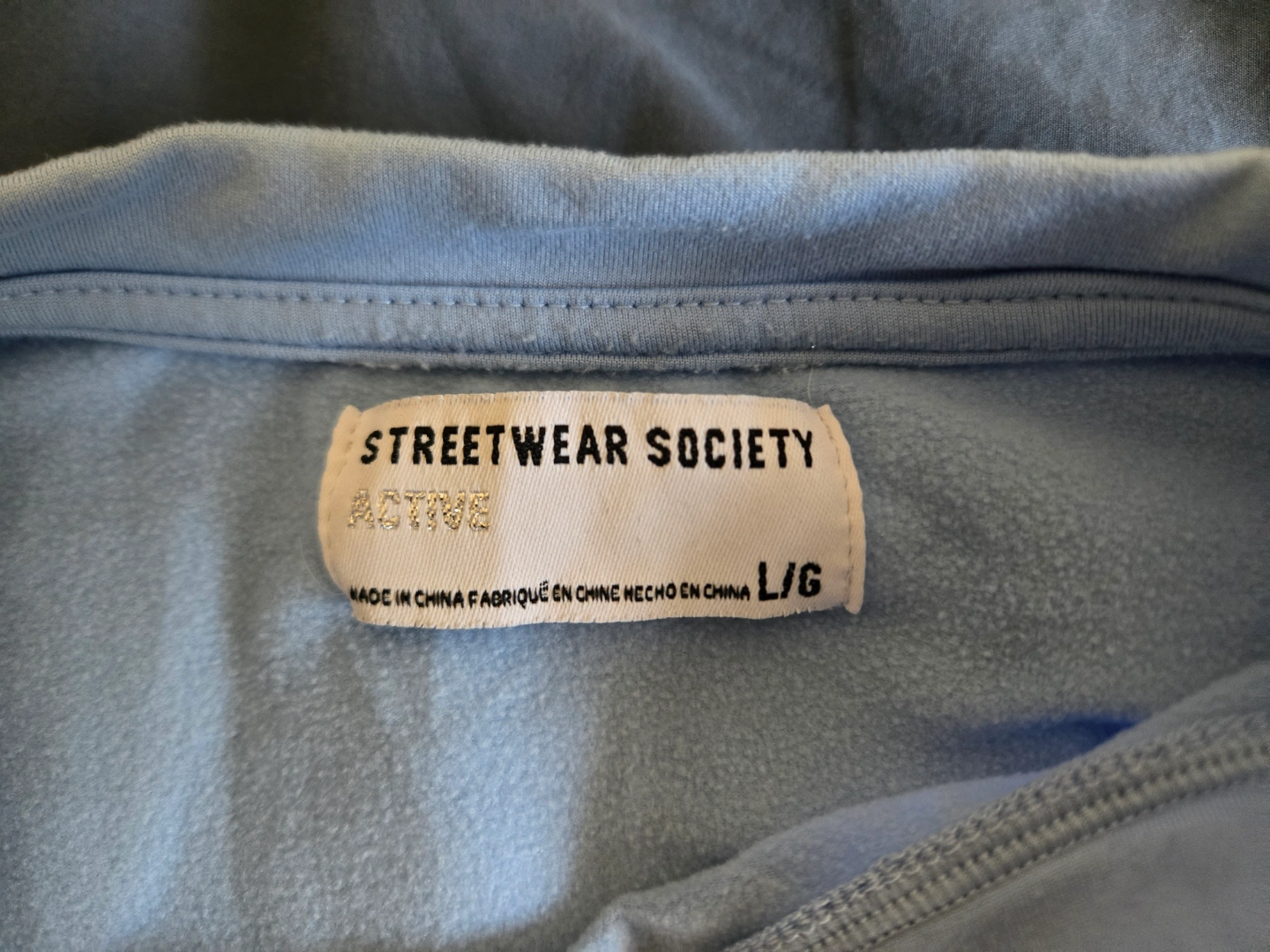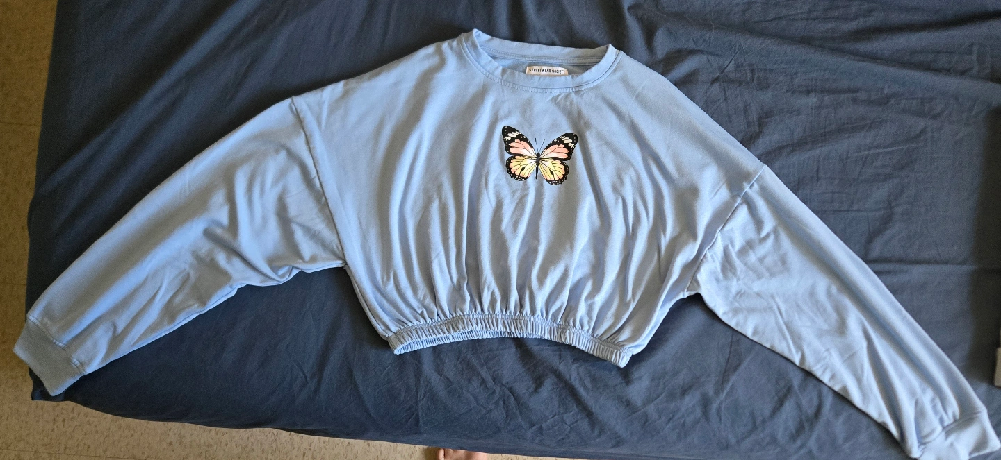 Cute light blue cropped sweatshirt. Features a butterfly applique. Long sleeves. Elastic waistband. Size large.