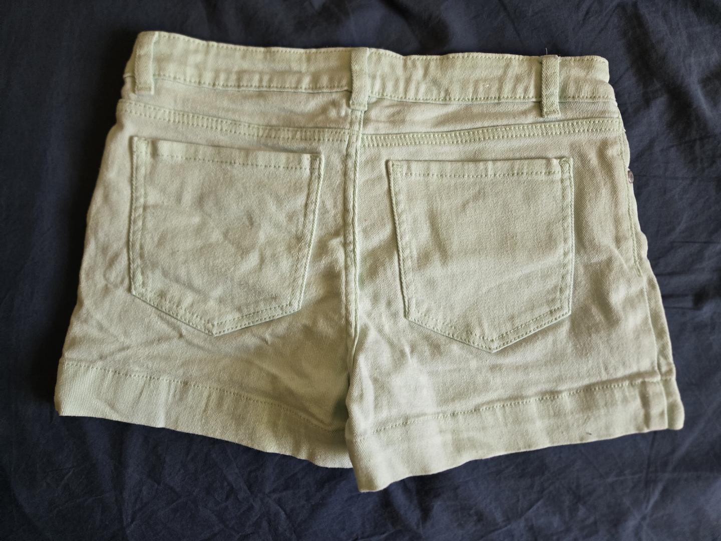 Women's light green denim shorts. Size 4. Five-pocket style. Rolled cuffs. Classic fit.