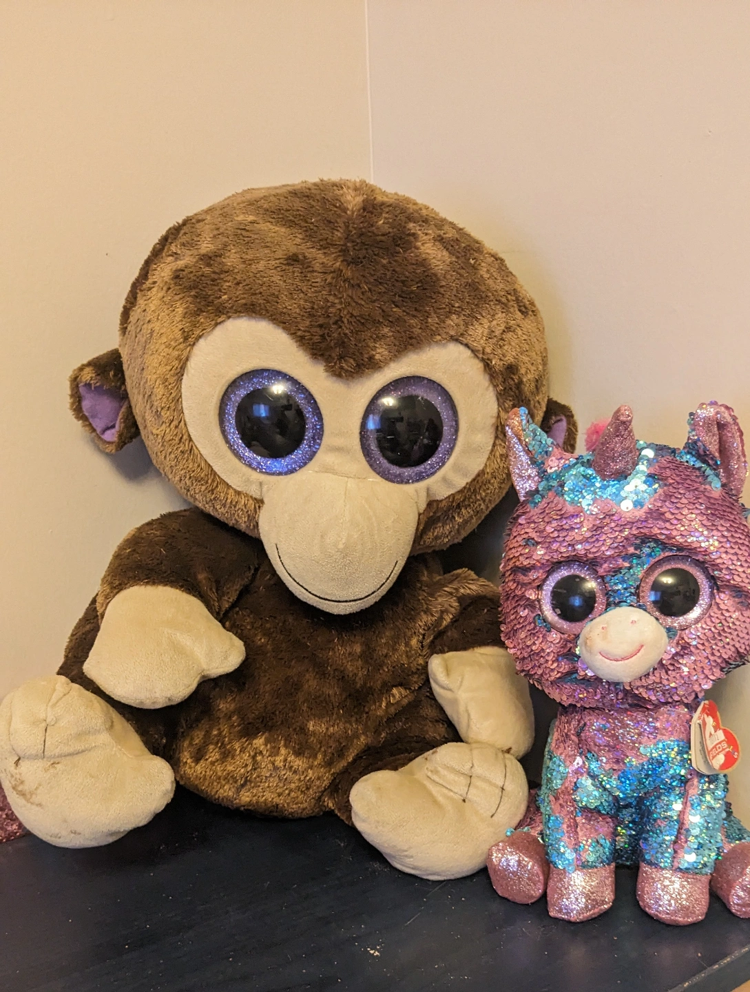Large brown monkey and smaller sparkly unicorn. Both plush toys have large eyes. Great for collectors or children. $5 each or both for $10