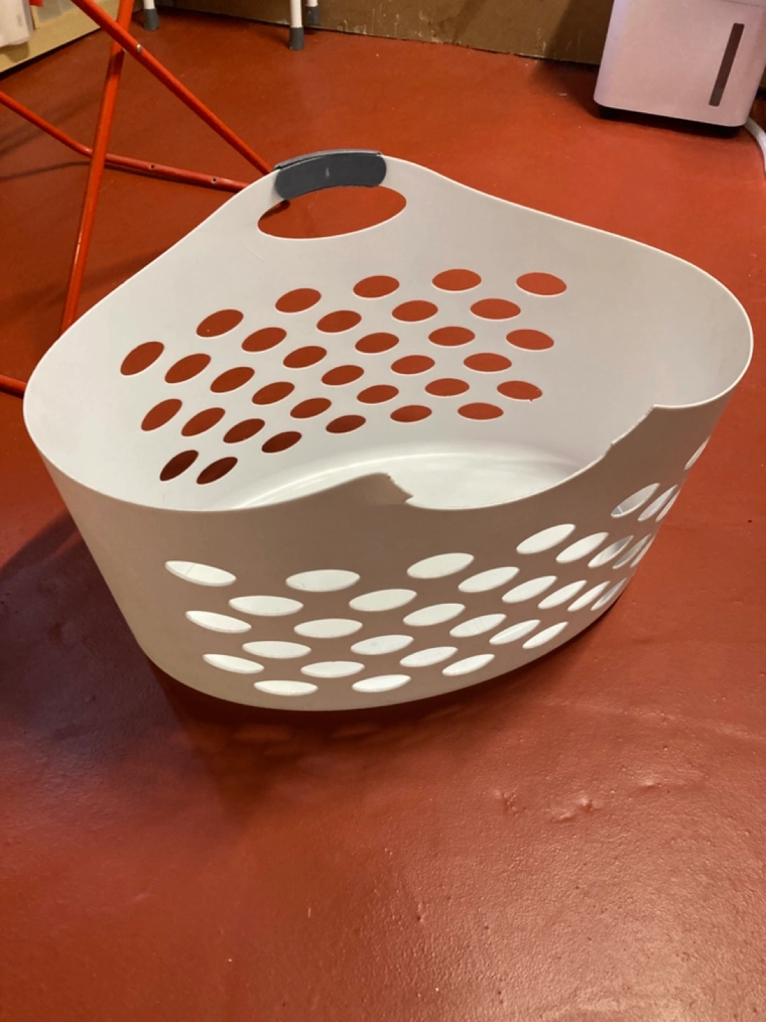 1000+Large capacity laundry basket. White plastic construction. One of the carrying handles has broken off, but the basket is still useful for storing things. Holes throughout for ventilation.