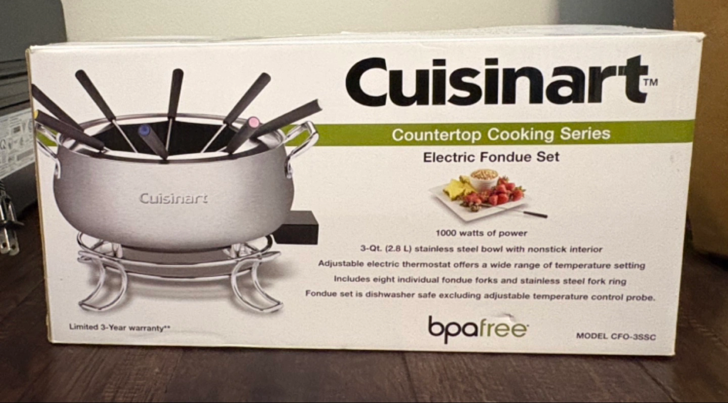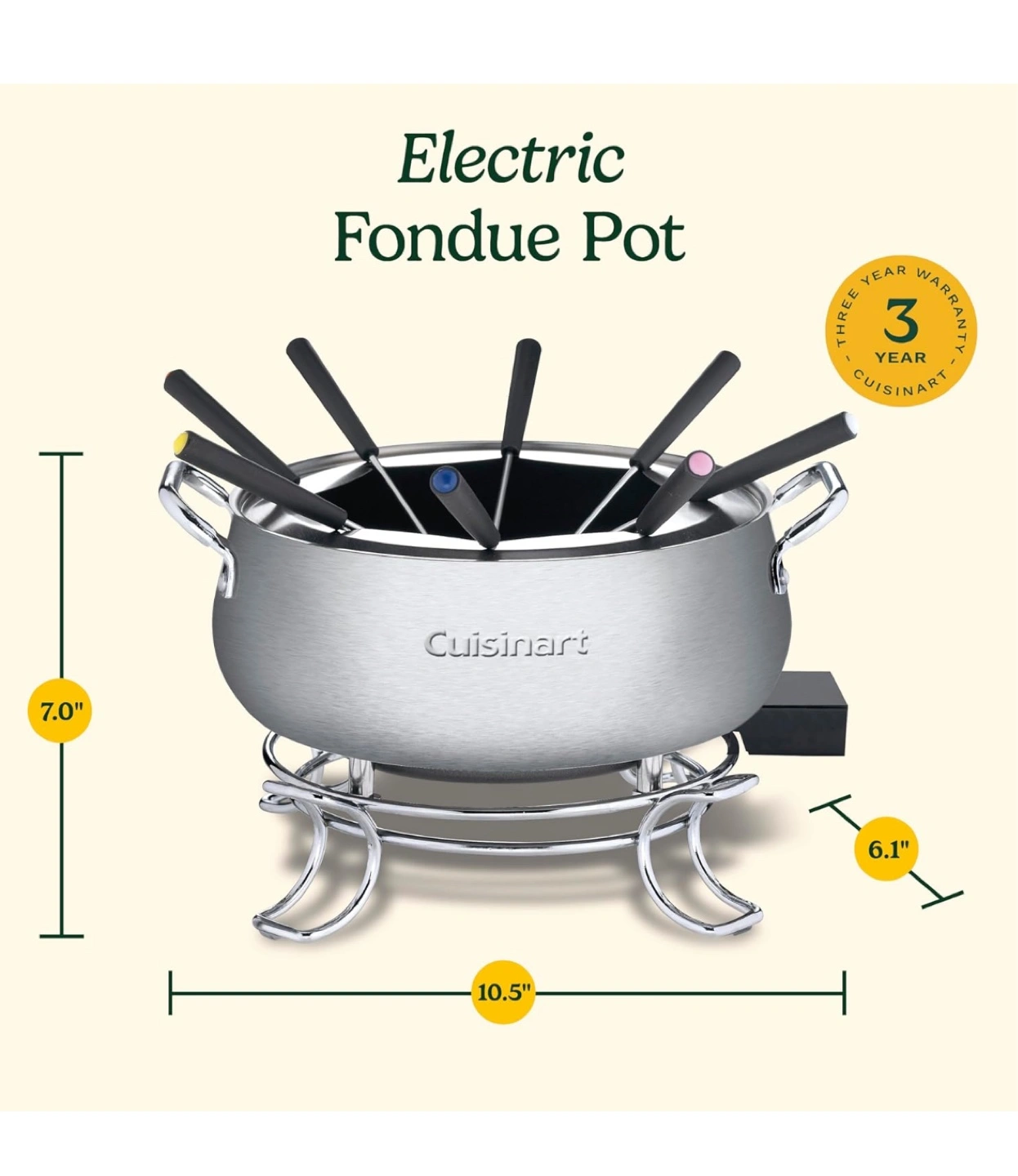 Cuisinart countertop electric fondue set. Features a 3-quart stainless steel pot, eight fondue forks, and adjustable temperature control. Non-stick interior. Dishwasher safe. Model CFO-3SSSC.