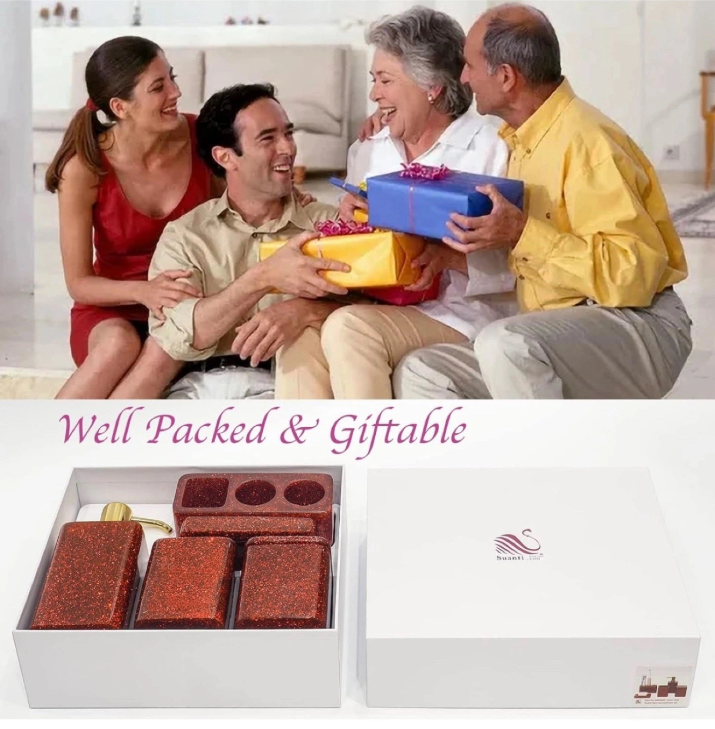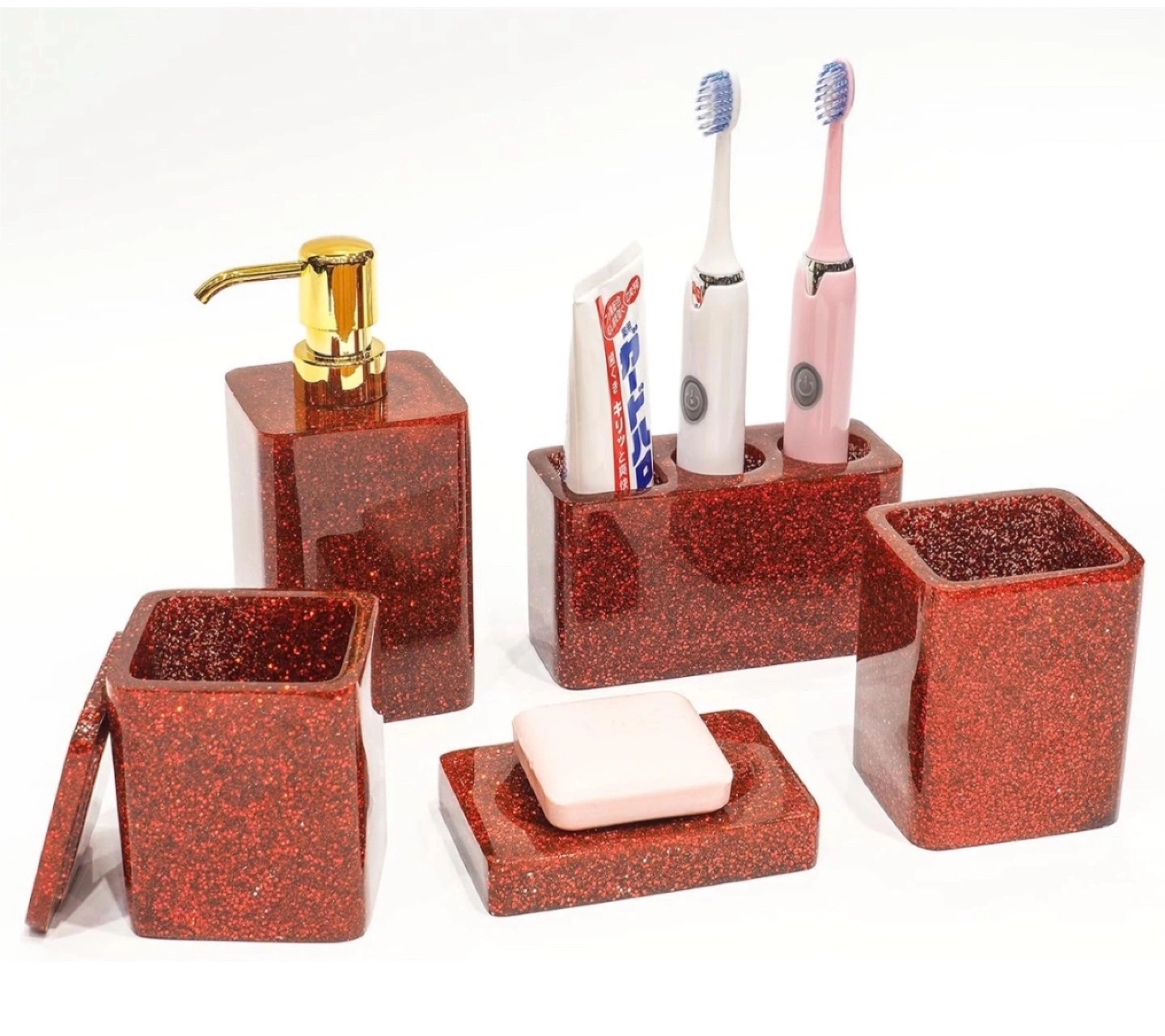 134Bathroom accessory set with a red glitter finish. Includes a soap dish, tumbler, cotton ball holder, toothbrush holder, and lotion dispenser. Suanti Bathroom Accessory Sets,5 pcs Red Bathroom Decor Sets with Lotion Dispenser, Soap Dish, Tumbler, Toothbrush Holder, Q Tip Holders 5pcs Bathroom Essentials Christmas gifts, birthday gifts Lotion Dispenser, Soap Dish, Tumbler, Toothbrush Holder, Q Tip Holders ✔Specification: Amount:5 PCS Colour: Green, Red Name: Suanti green bathroom accessories Occasion: Family, hotel, restaurant Material: Suanti resin material BPA free, no lead, no cadmium, non-toxic and safe. ✔Package includes:1 x lotion dispenser (14.5 OZ),1 x tumbler (2.8"L x3.1"W x3.9"H) ,1 x soap dish (4.6"L x3"W x 0.7"H),1 x lidded storage canister (2.8"L x3.1"W x3.9"H),1 x toothbrush holder (5.6"L x 2.2"W x 3"H),Holder stores 2 electric toothbrush and 1 toothpaste ✔Attention:1. Wash and dry before the first use, and put it in a ventilated place for 2-3 days to dissipate the smell. 2.Dishwasher cannot be used. (-30℃~70℃). 3. Do not scrub with hard objects to avoid scratches on the surface.