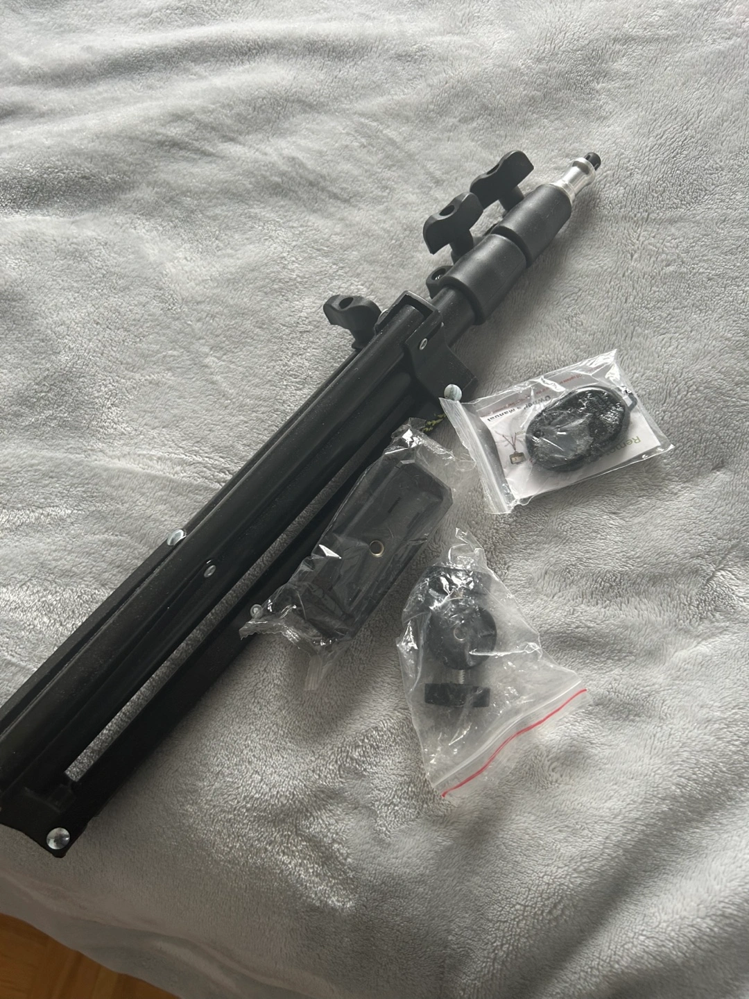 54Lightweight, adjustable photography stand. Includes all parts shown. Collapsible design for easy storage and transport. Ideal for studio or on-location use.