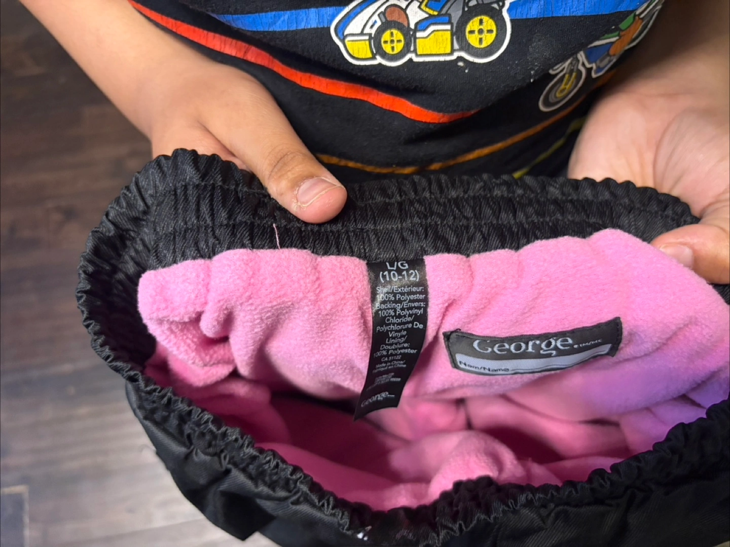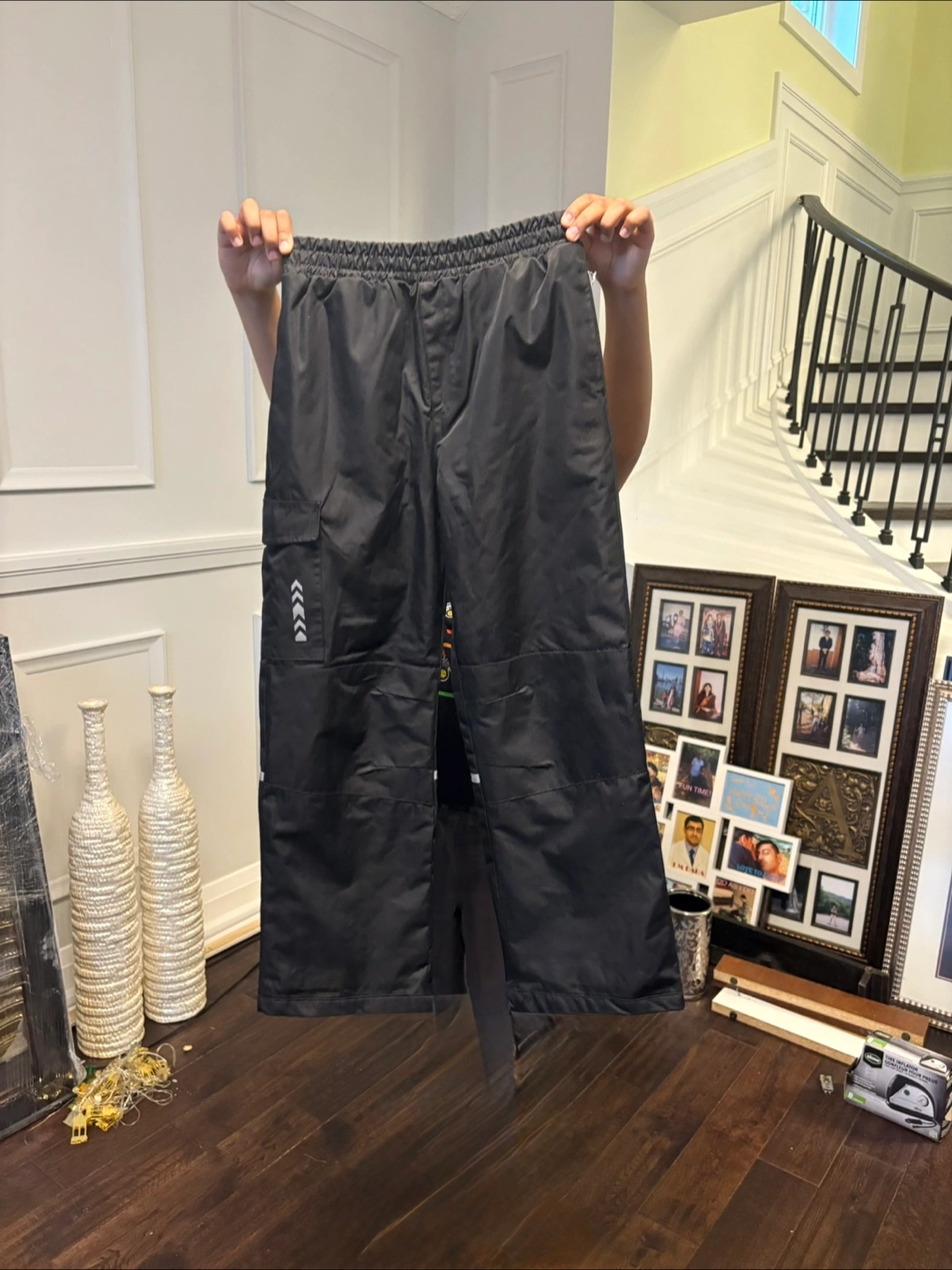 Black snow pants. Size large/grande (10-12). Pink Fleece lined. Elastic waistband. Side pockets. Reflective detailing.