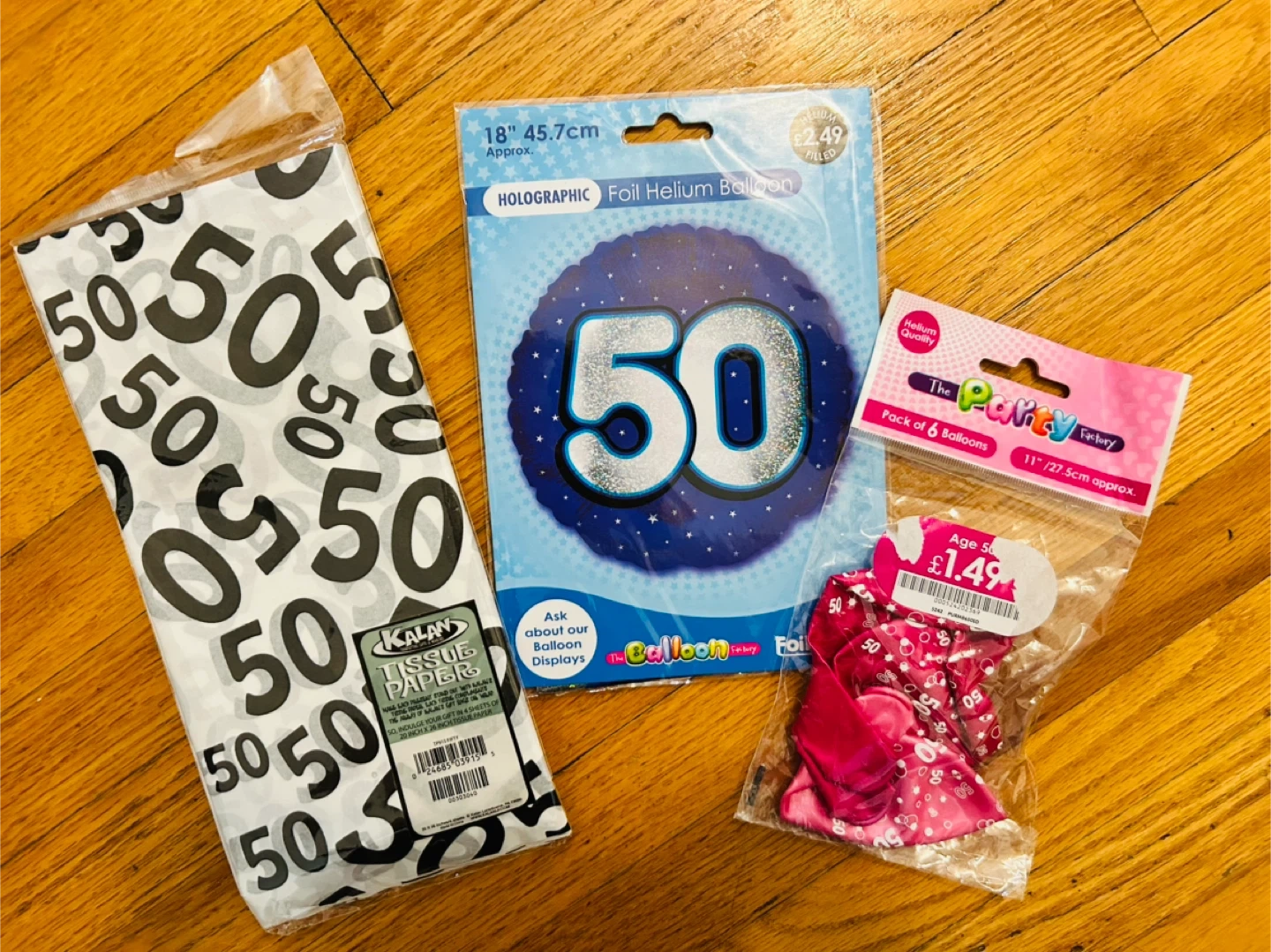 Getting ready for a 50th birthday party? I have a few decorations available: - A pack of 6 pink balloons from The Party Factory, each about 11 inches / 27.5cm - A holographic foil helium balloon, approximately 18 inches / 45.7cm - Kalan tissue paper with a '50' print, containing 4 sheets of 20 inch x 26 inch tissue paper