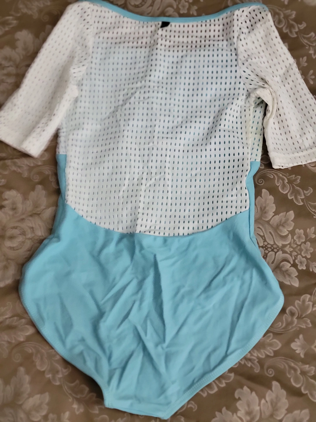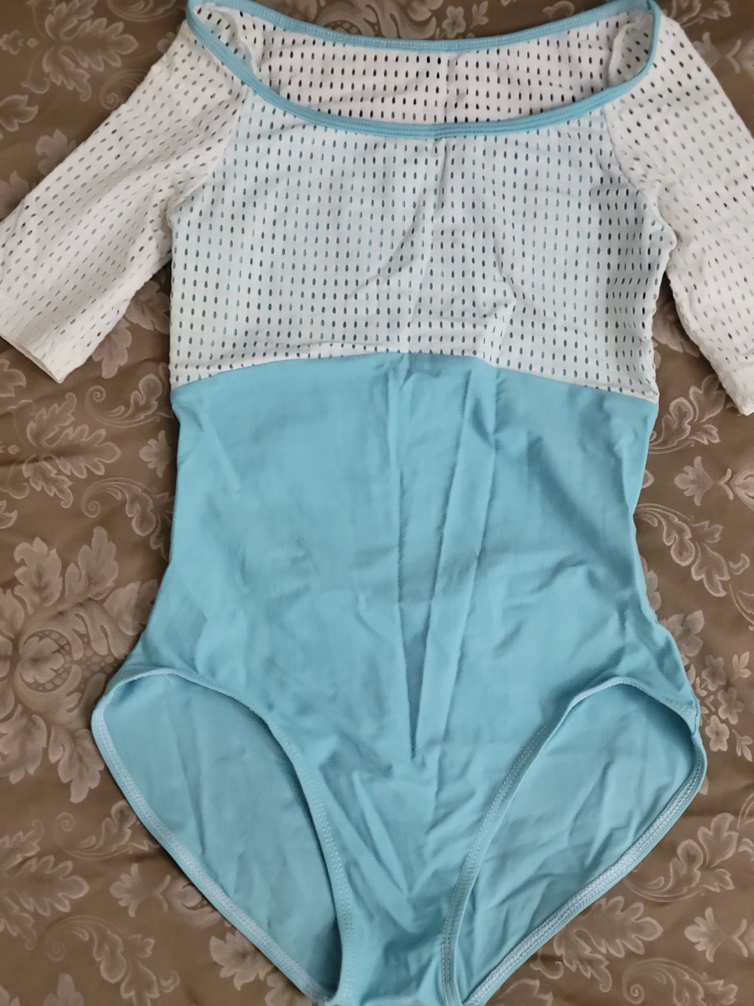Beautiful dance leotard. Light blue and white. Half mesh, half solid. Short sleeves. Scoop neck. Excellent for ballet, modern, or contemporary dance.